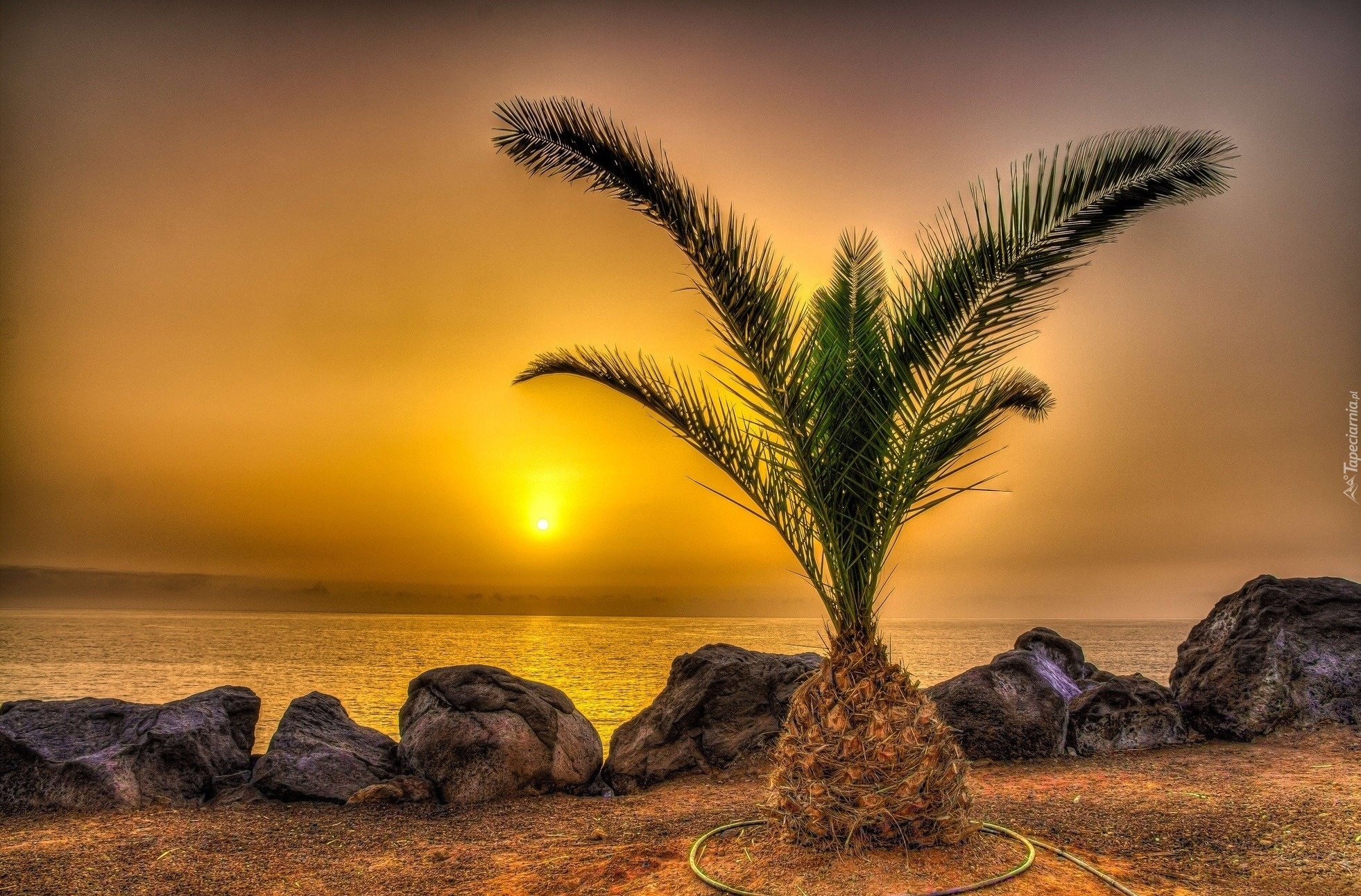 Edytor tapety: Morze, Zachód, Słońca, Kamienie, Palma