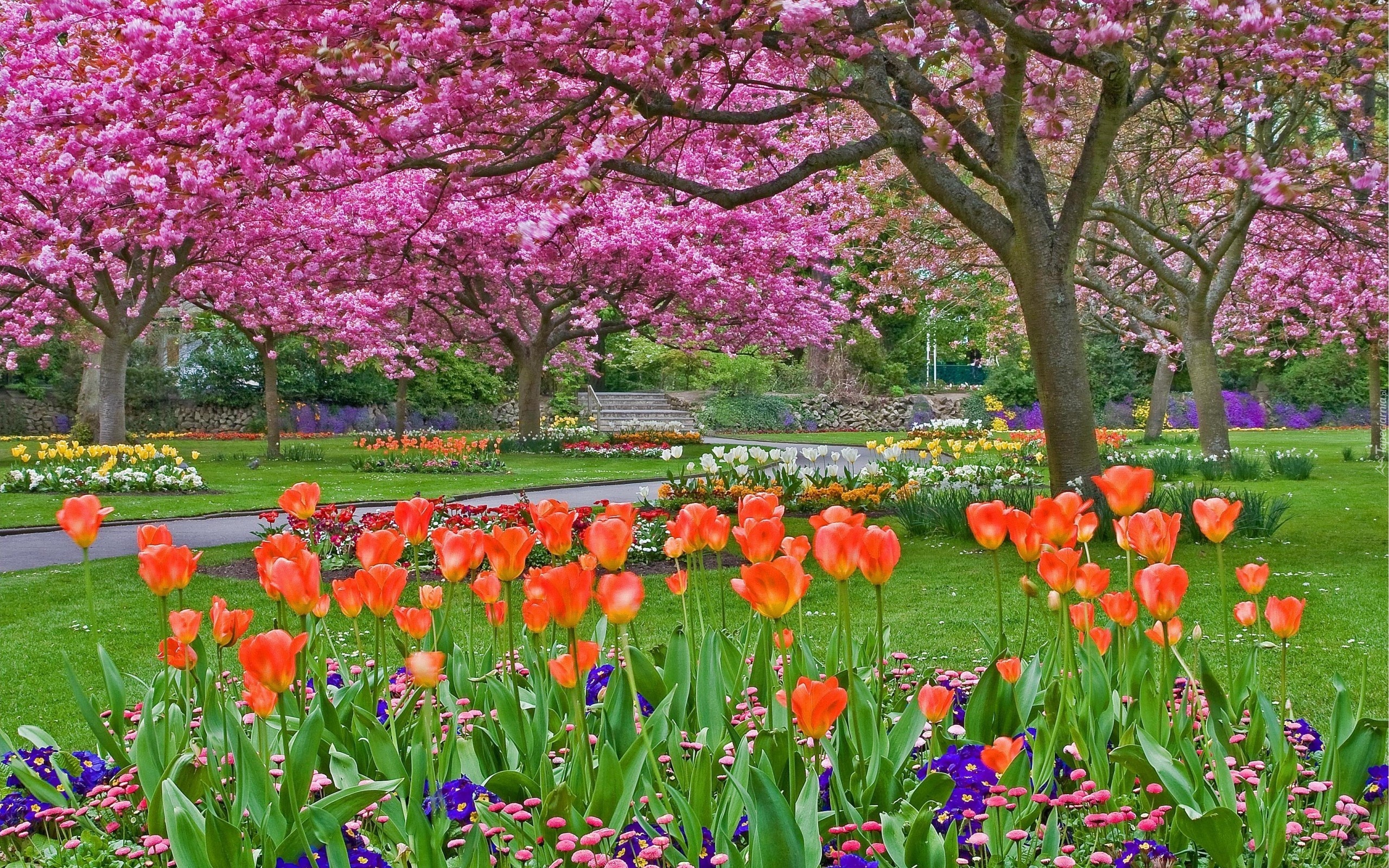 Edytor tapety: Park, Alejki, Kwitnące, Drzewa, Klomby, Tulipany, Wiosna