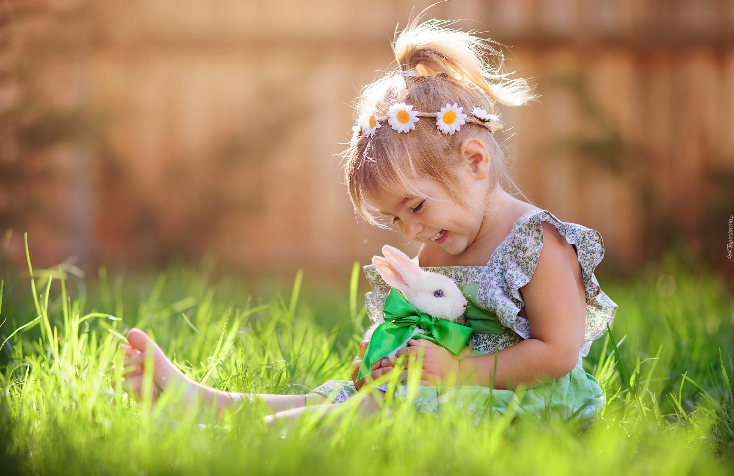 Edytor tapety: Dziewczynka, Wianuszek, Łąka, Królik, Wiosna