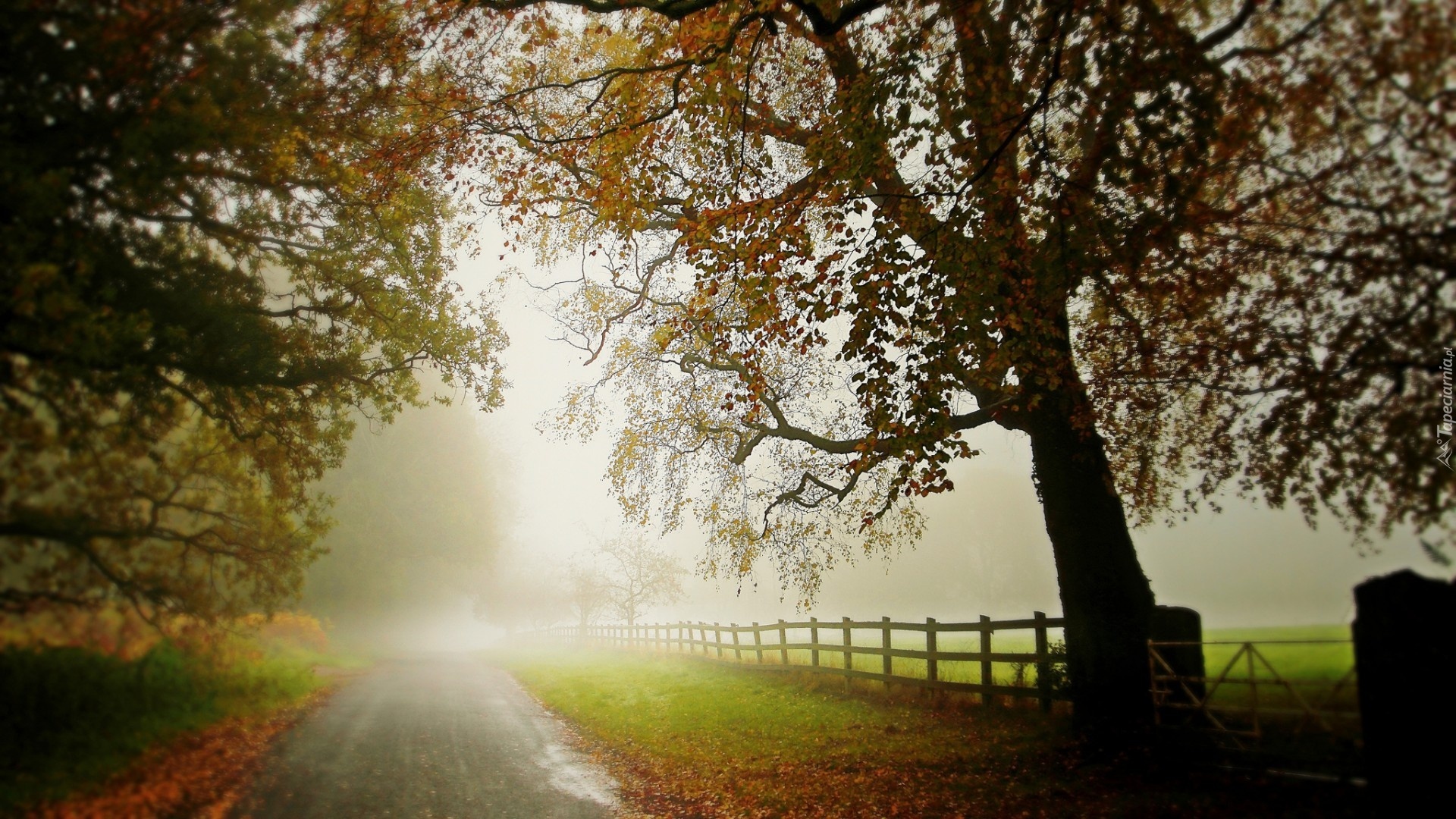 Edytor tapety: Droga, Drzewa, Liście, Mgła, Łąki, Ogrodzenie, Jesień