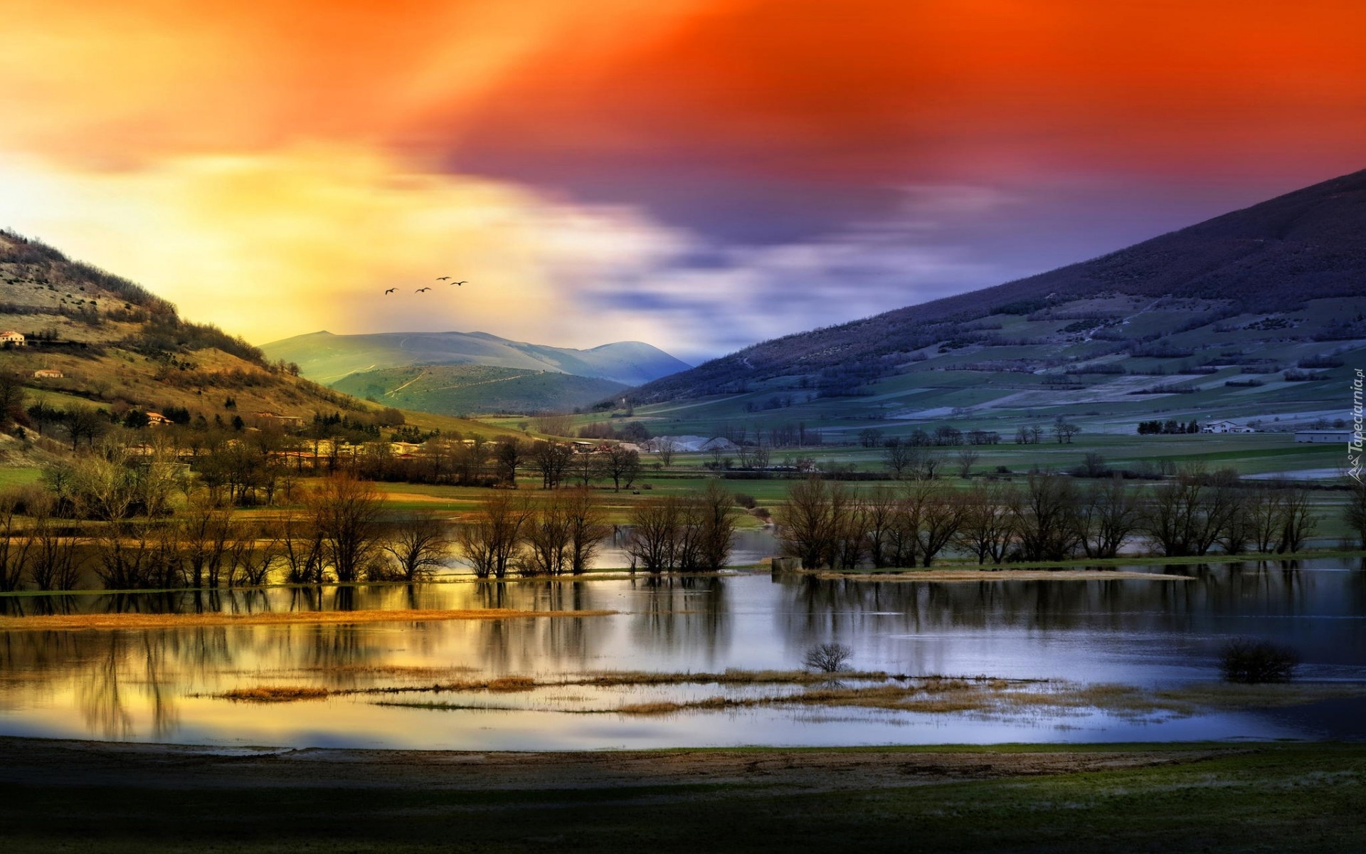 Edytor tapety: Rzeka, Pola, Łąki, Domy, Góry, Chmury, Ptaki
