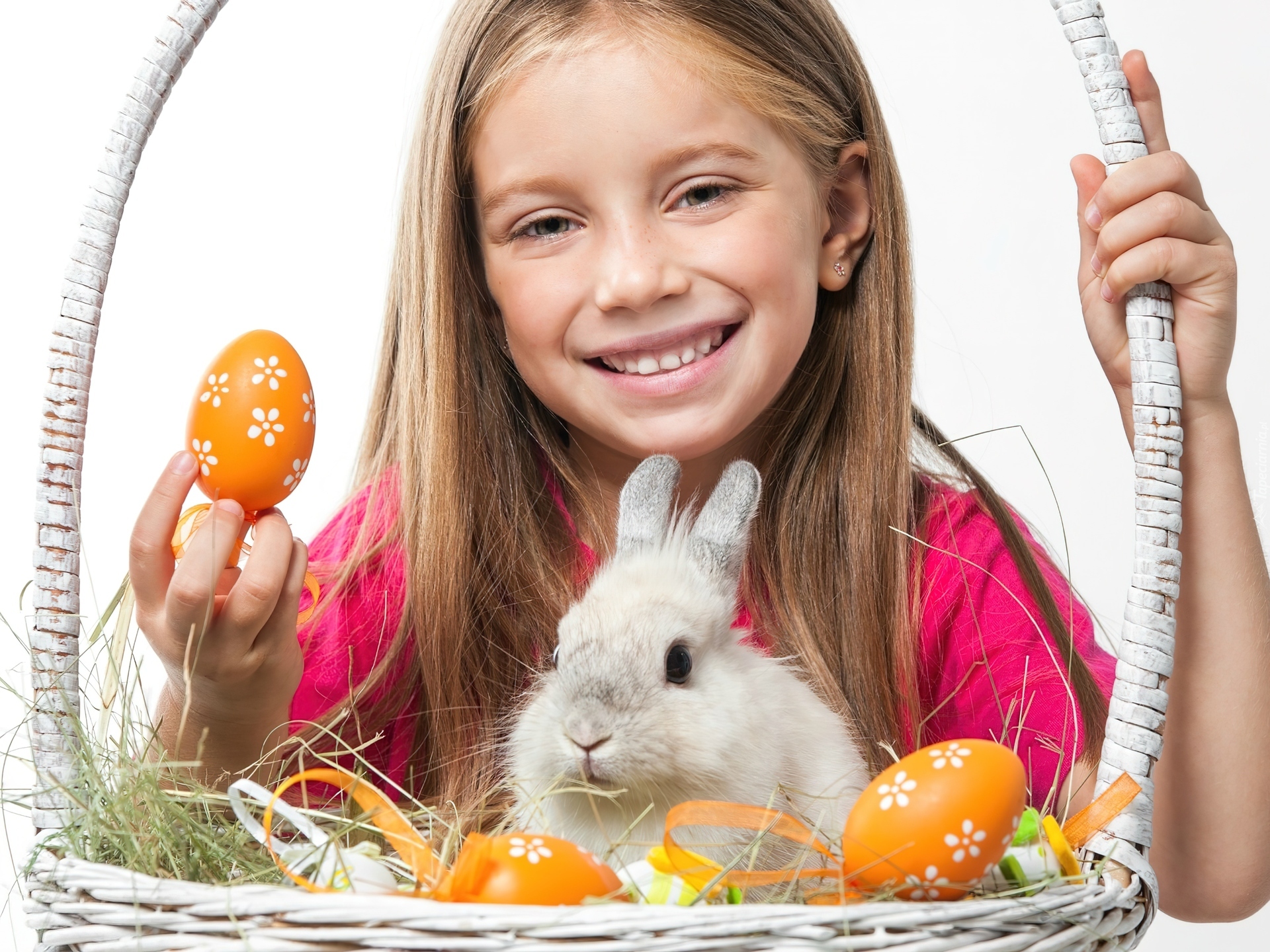Edytor tapety: Dziewczynka, Królik, Pisanki, Koszyk, Wielkanoc