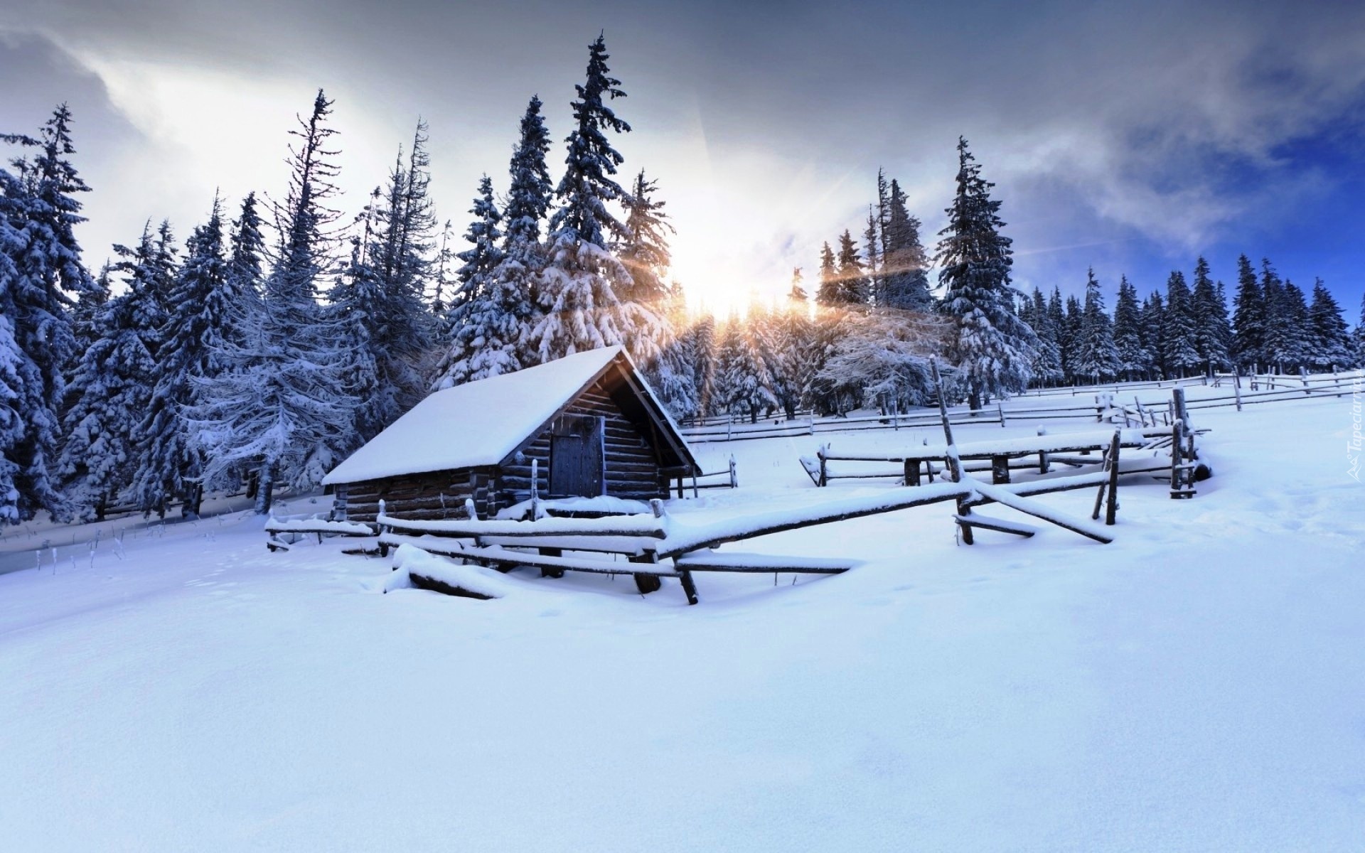 Edytor tapety: Domek, Las, Promienie Słońca, Zima