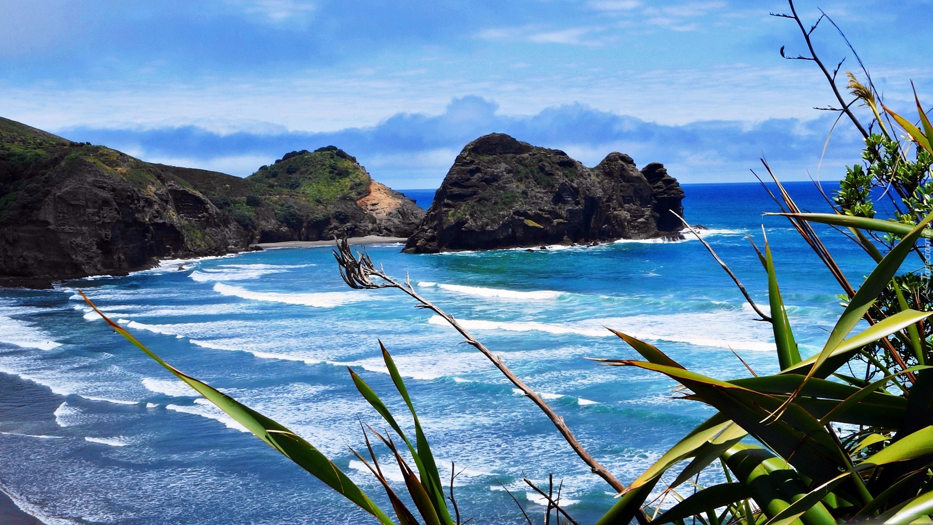 Edytor tapety: Morze, Skały, Roślinność, Przebijające, Światło, Piha, Beach