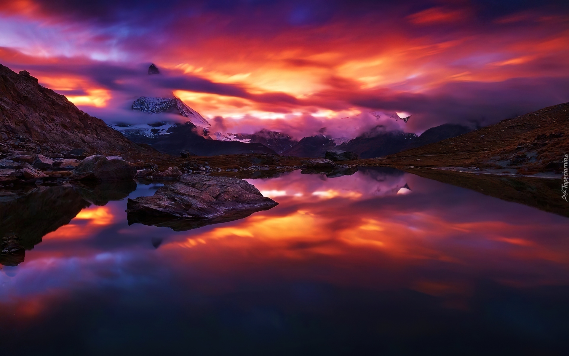 Edytor tapety: Zachód, Słońca, Góry, Odbicie