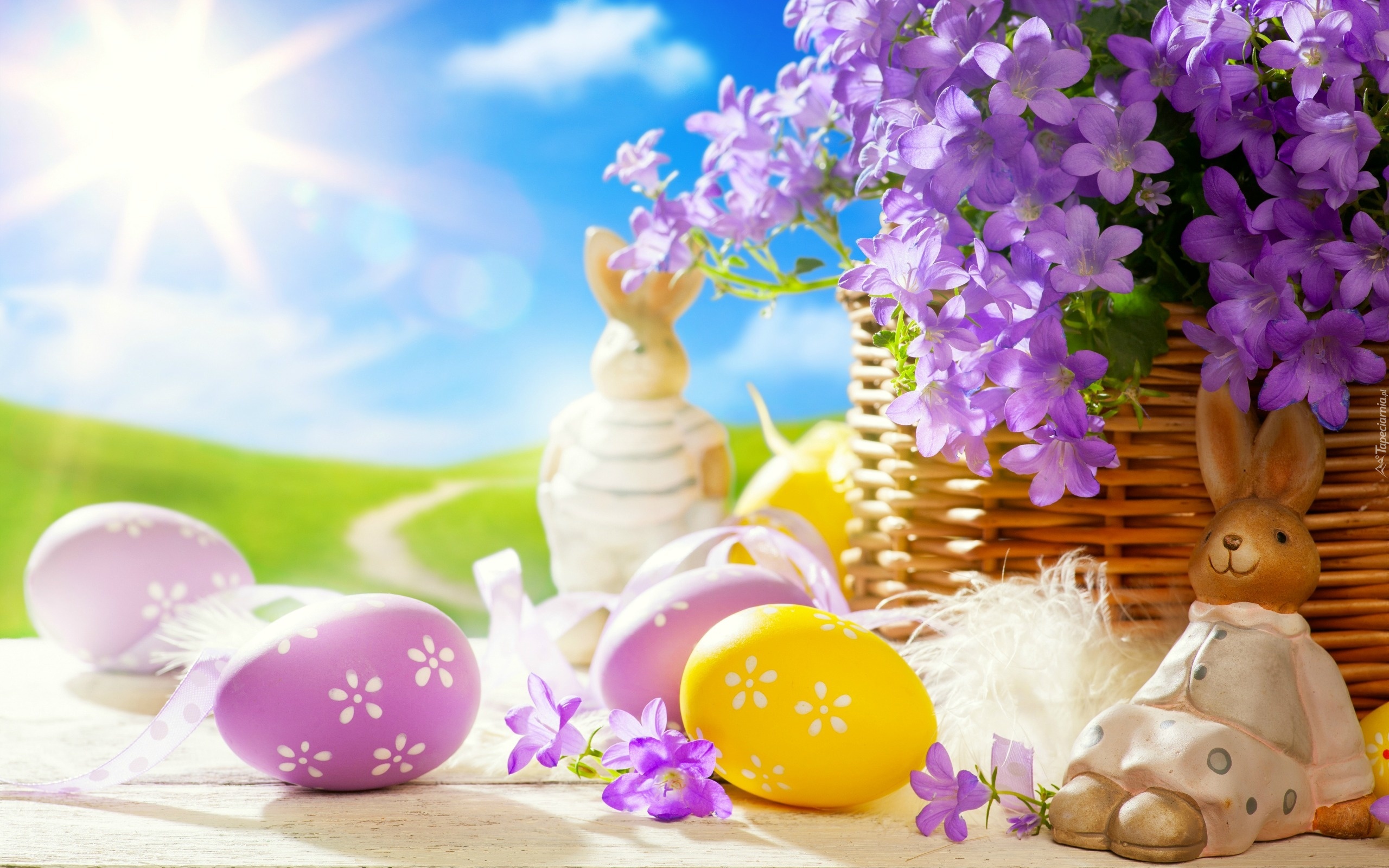 Edytor tapety: Pisanki, Zajączki, Kosz, Kwiaty, Wielkanoc, Kompozycja
