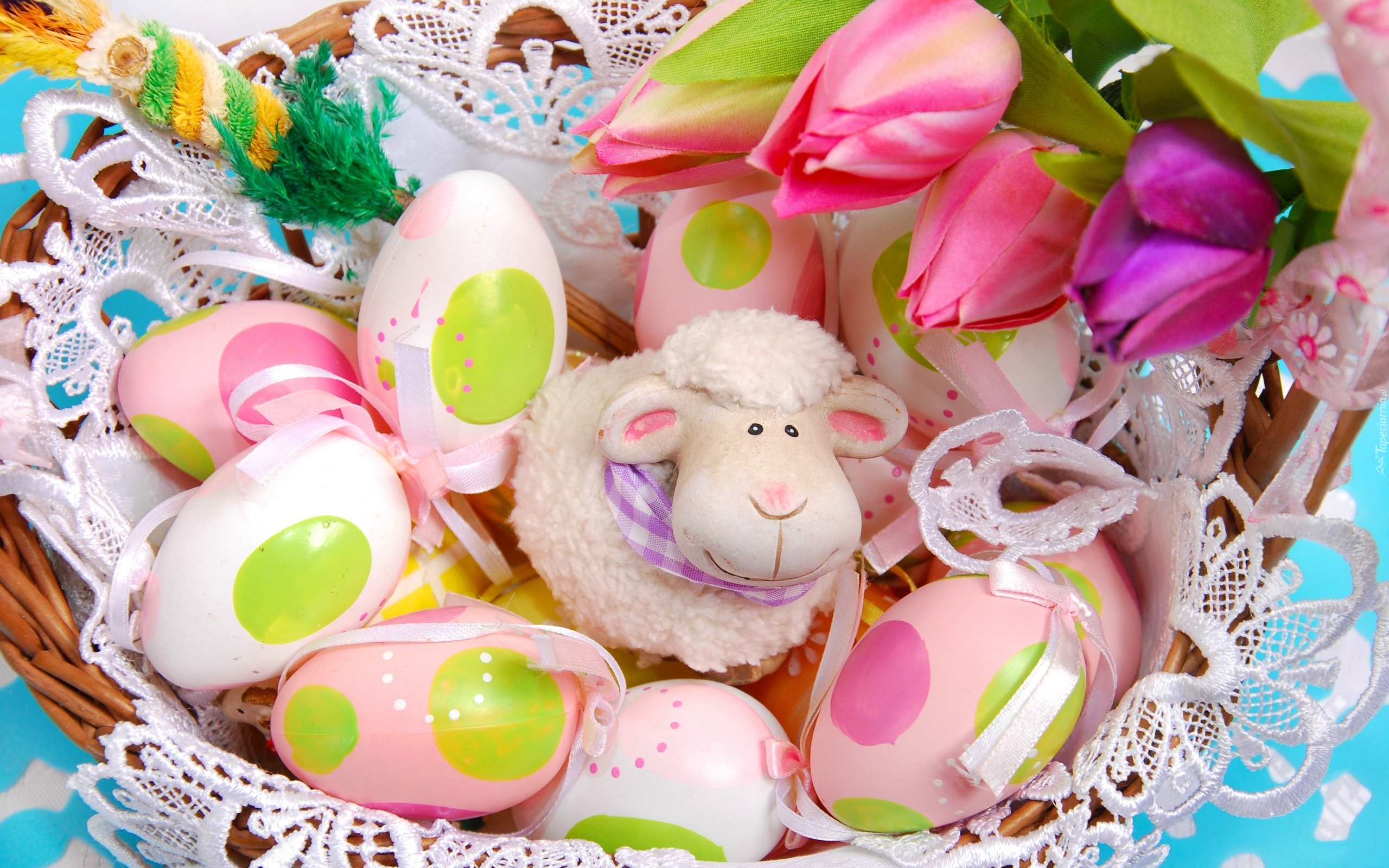 Edytor tapety: Baranek, Pisanki, Tulipany, Palma, Kosz, Wielkanoc