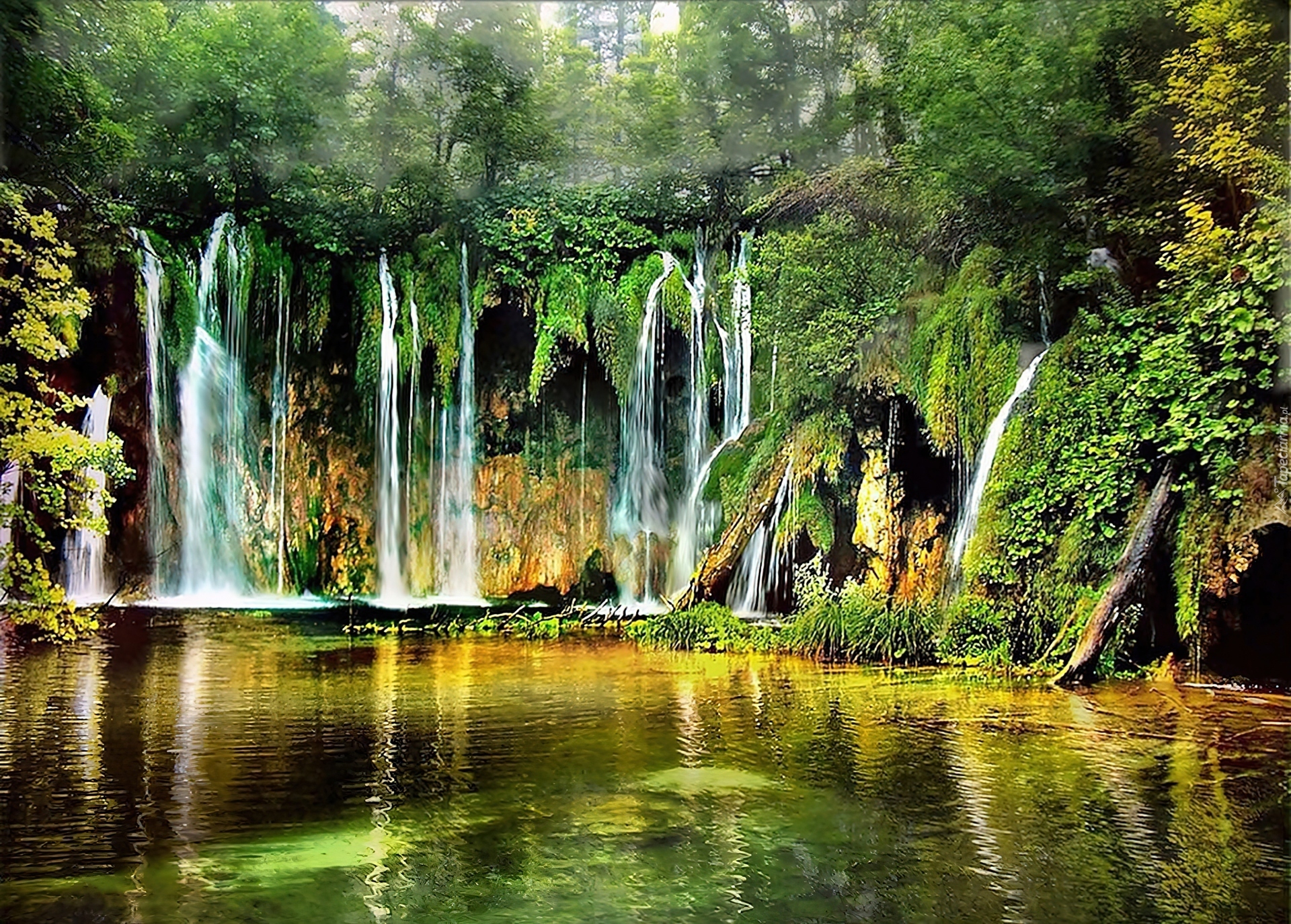 Edytor tapety: Las, Jezioro, Wodospad, Skały