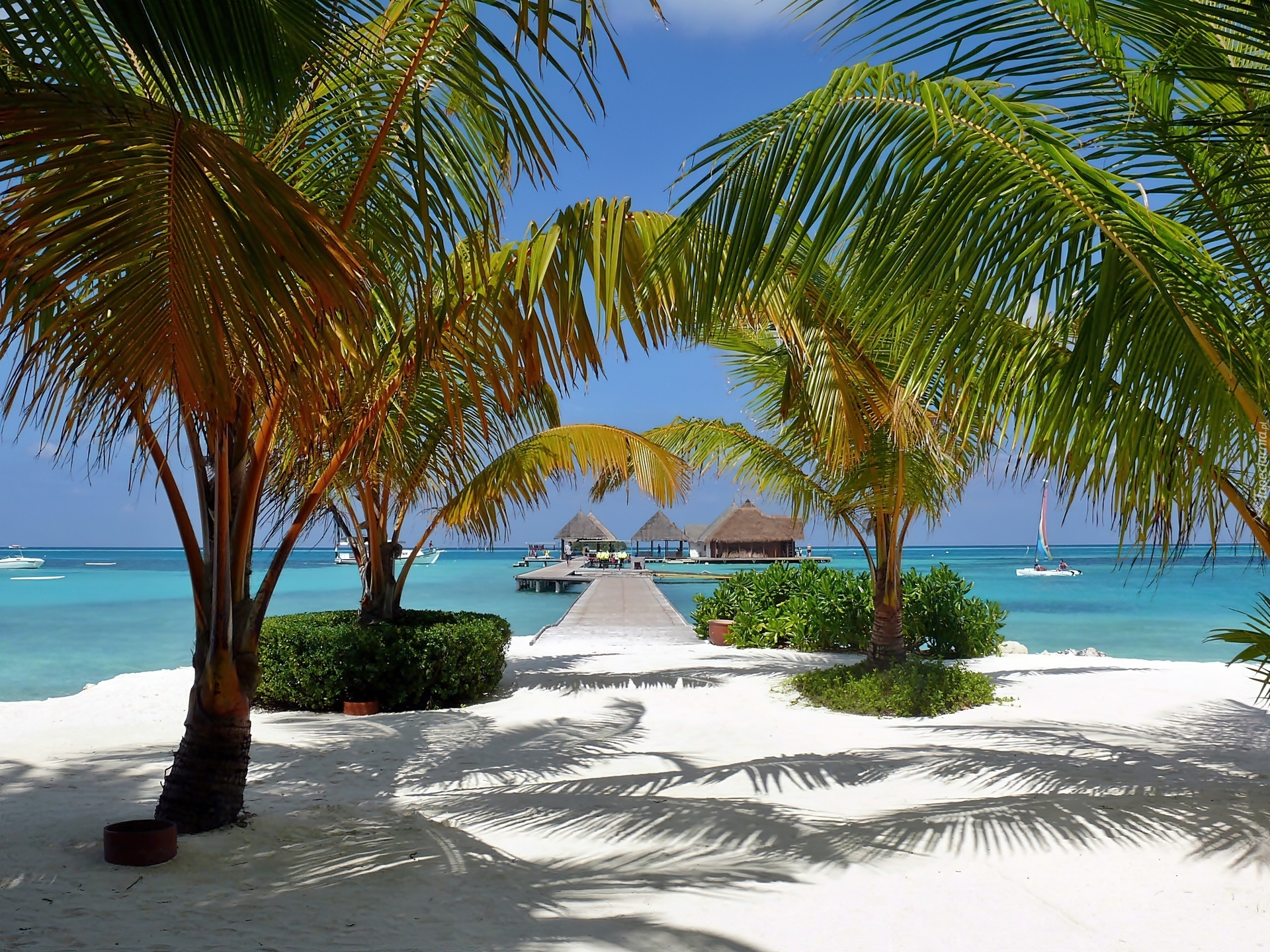 Edytor tapety: Morze, Plaża, Palmy, Pomost, Domki, Na Wodzie