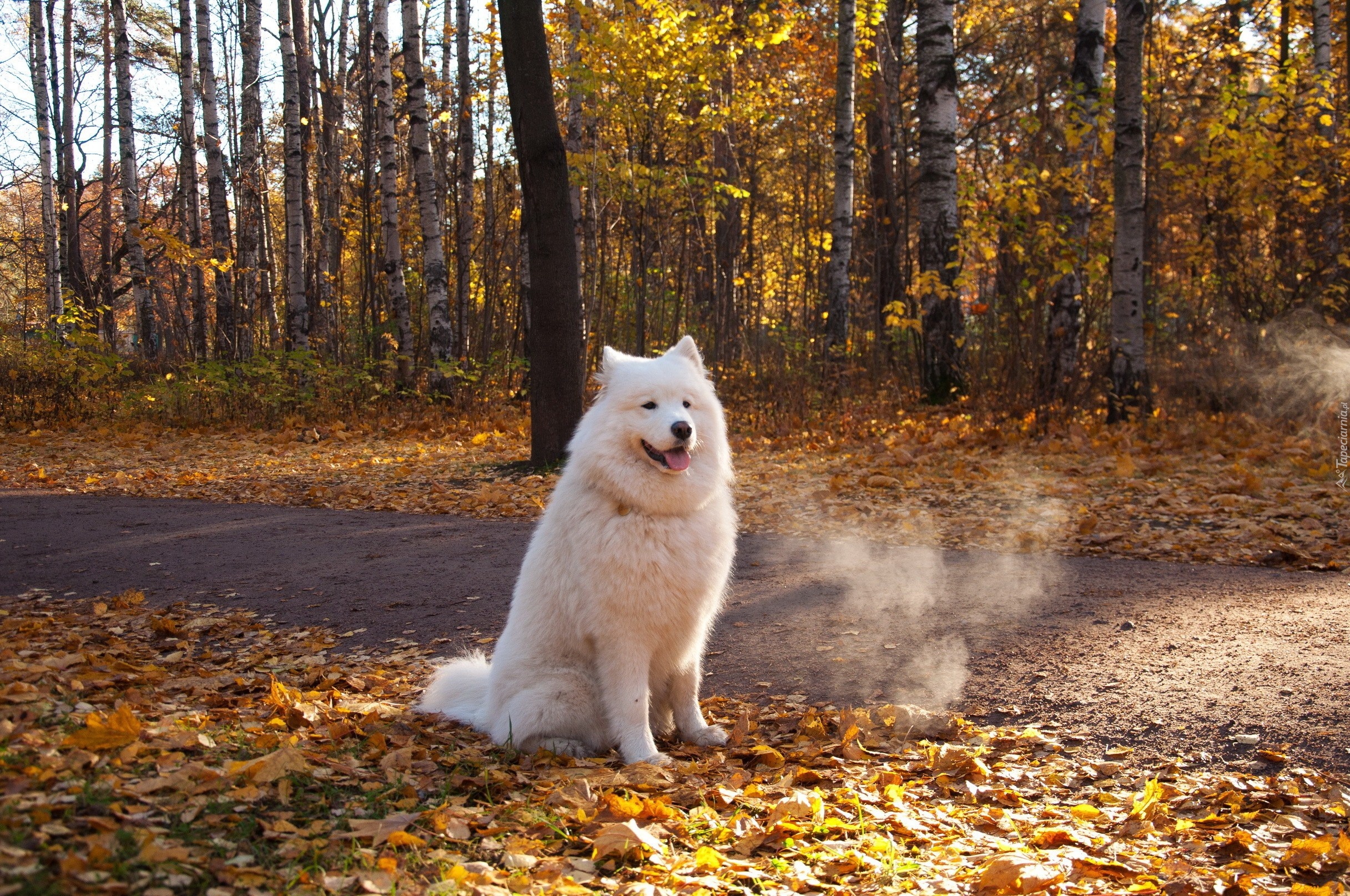 Edytor tapety: Biały, Pies, Samojed, Las, Droga, Liście, Jesień