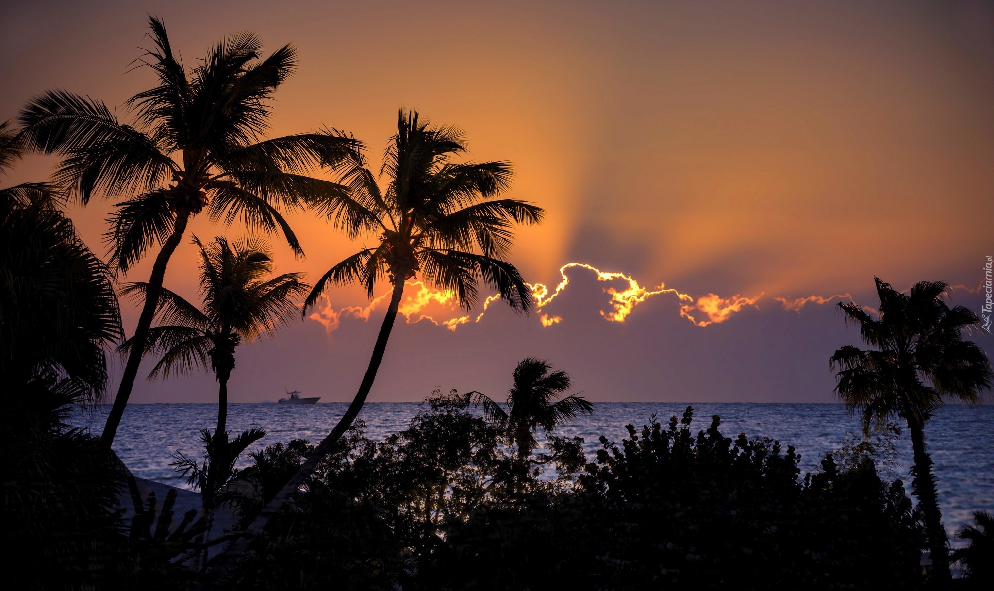 Edytor tapety: Morze, Statek, Palmy, Chmury, Zachód, Słońca