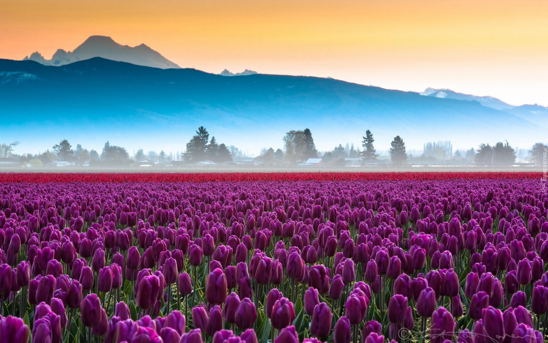 Edytor tapety: Pole, Tulipanów, Góry, Mgła, Poranek