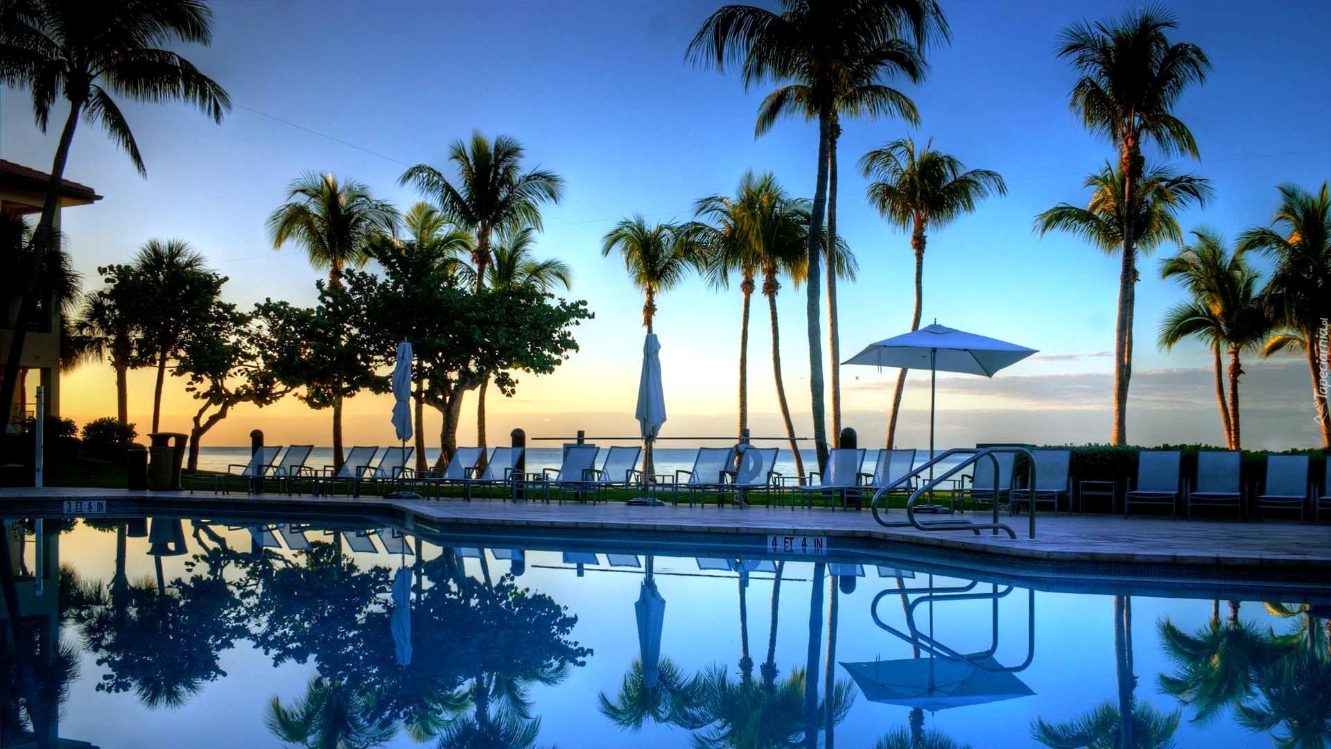 Edytor tapety: Basen, Leżaki, Palmy, Morze, Wakacje