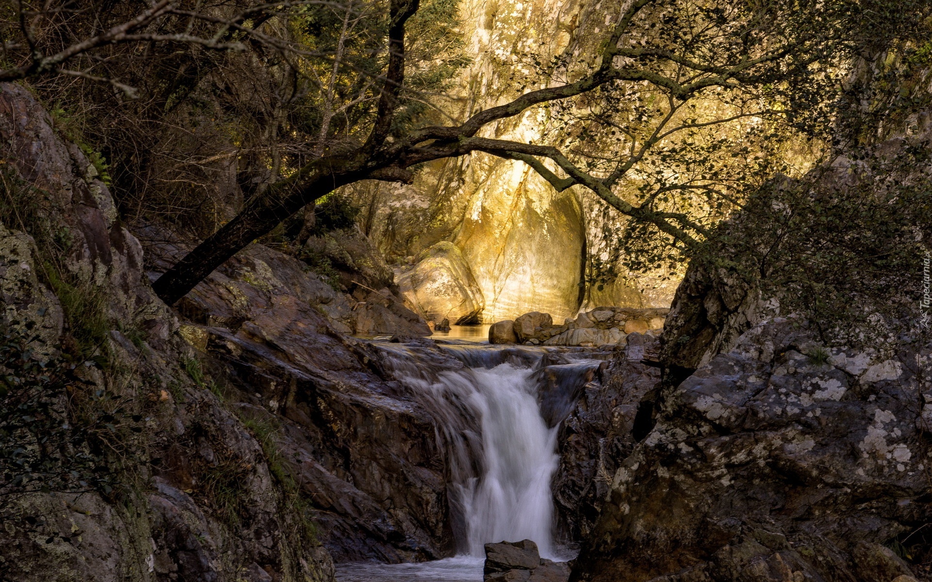 Edytor tapety: Wodospad, Skały, Las, Przebijające, Światło, Jesień