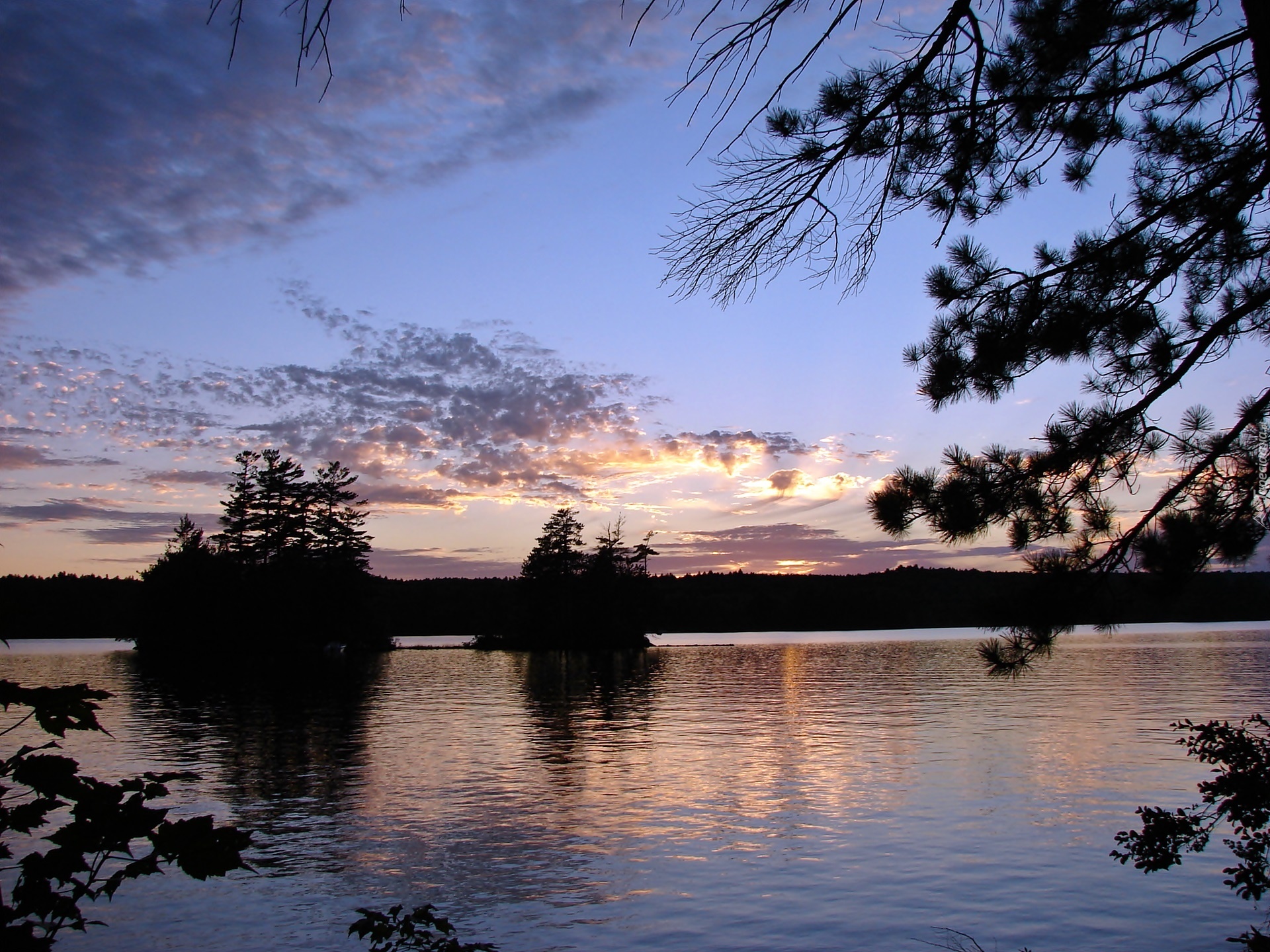 Edytor tapety: Jezioro, Wysepki, Lasy, Chmury, Świt