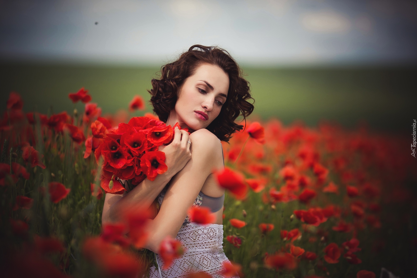 Edytor tapety: Kobieta, Pole, Bukiet, Maki