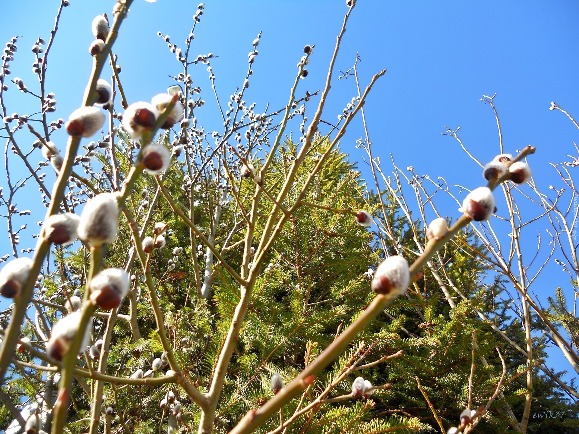 Edytor tapety: Wiosna, Choinka, Drzewo, Gałęzie, Bazie, Niebo