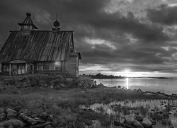 Edytor tapety: Ukraina, Drewniany, Kościół, Jezioro, Trawa, Zachód, Słońca