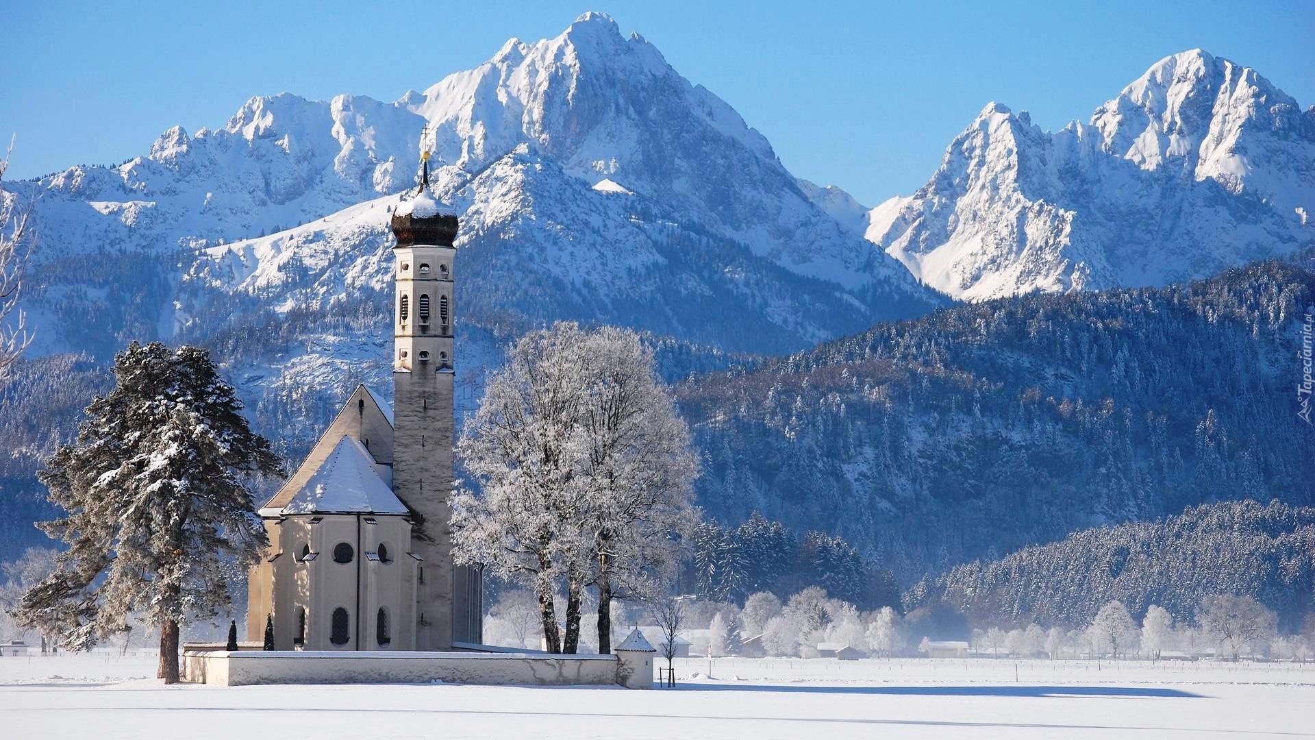 Edytor tapety: Kościółek, Góry, Lasy, Zima