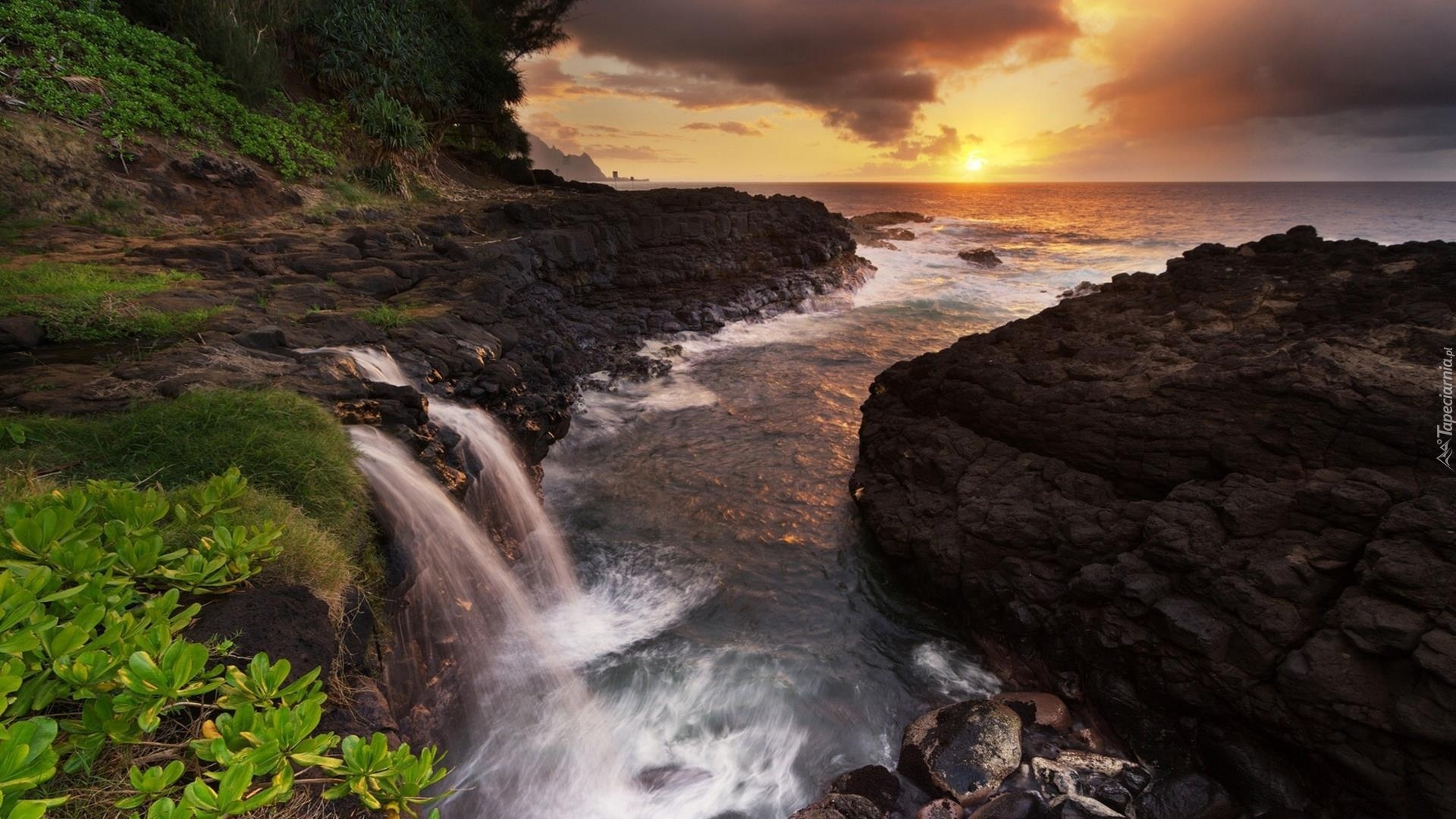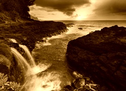 Edytor tapety: Zachód, Słońca, Morze, Wodospad, Skały