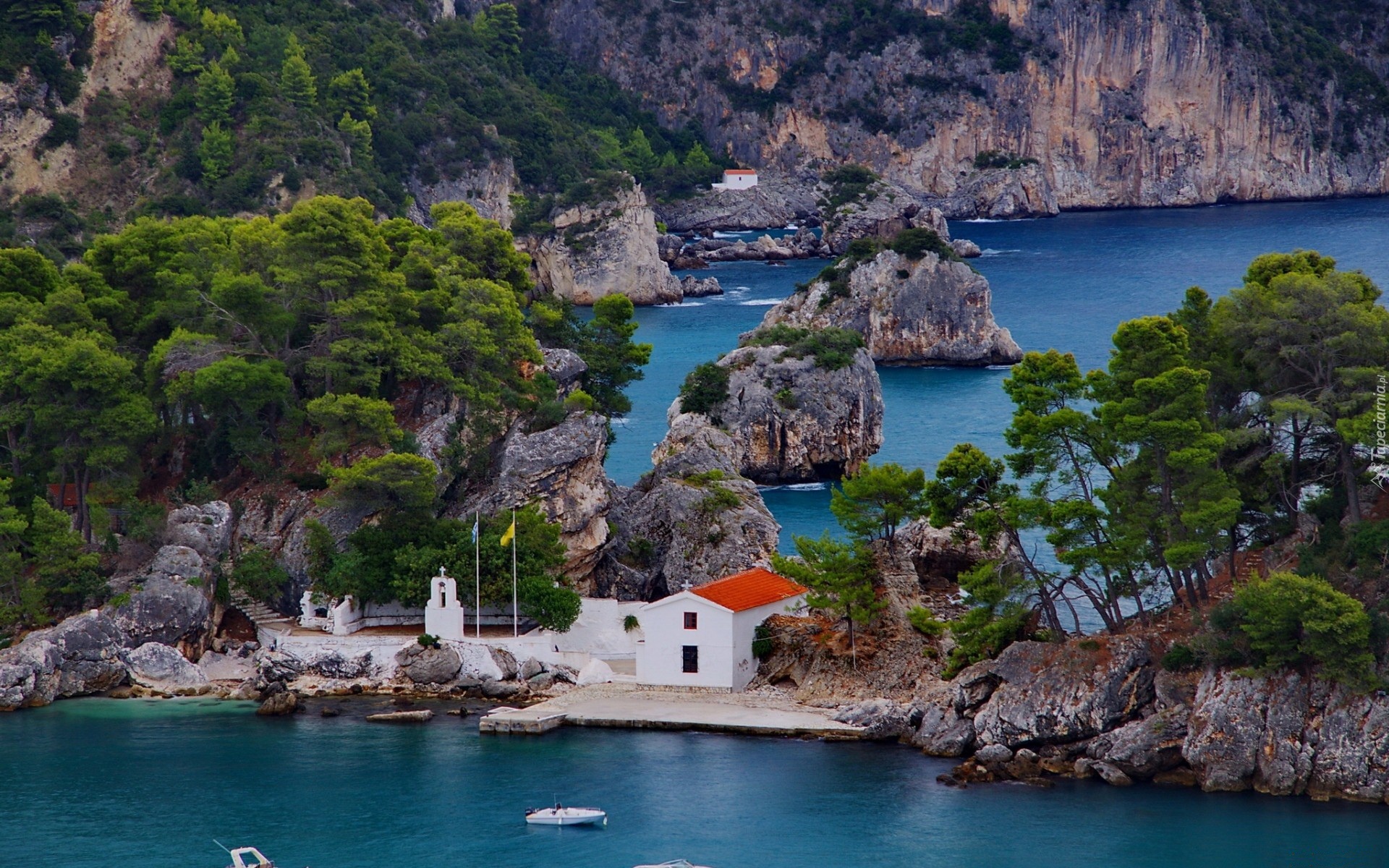 Edytor tapety: Kaplica, Góry, Skały, Jezioro, Drzewa