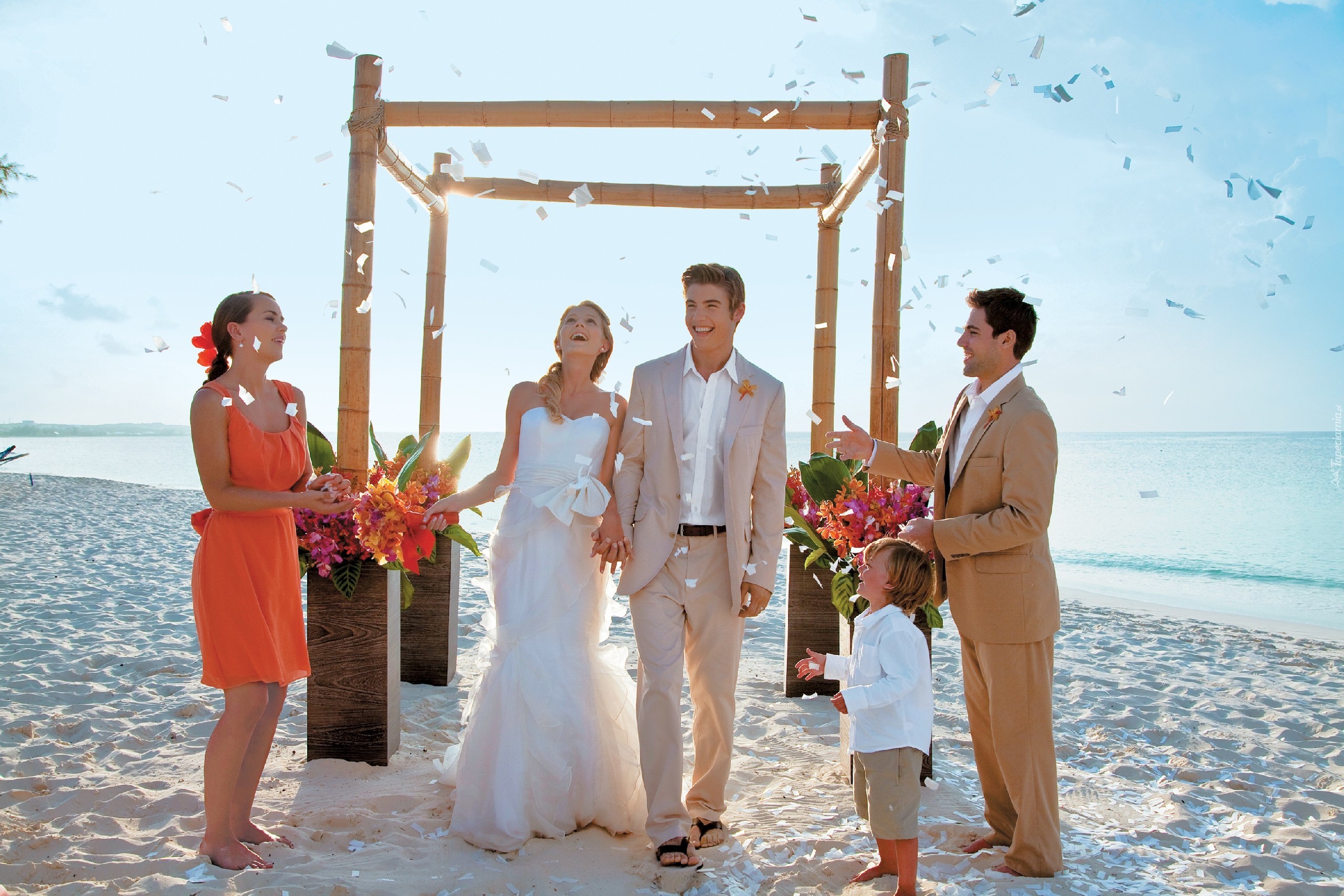 Edytor tapety: Para, Młoda, Drużba, Dziecko, Morze, Plaża, Bukiety