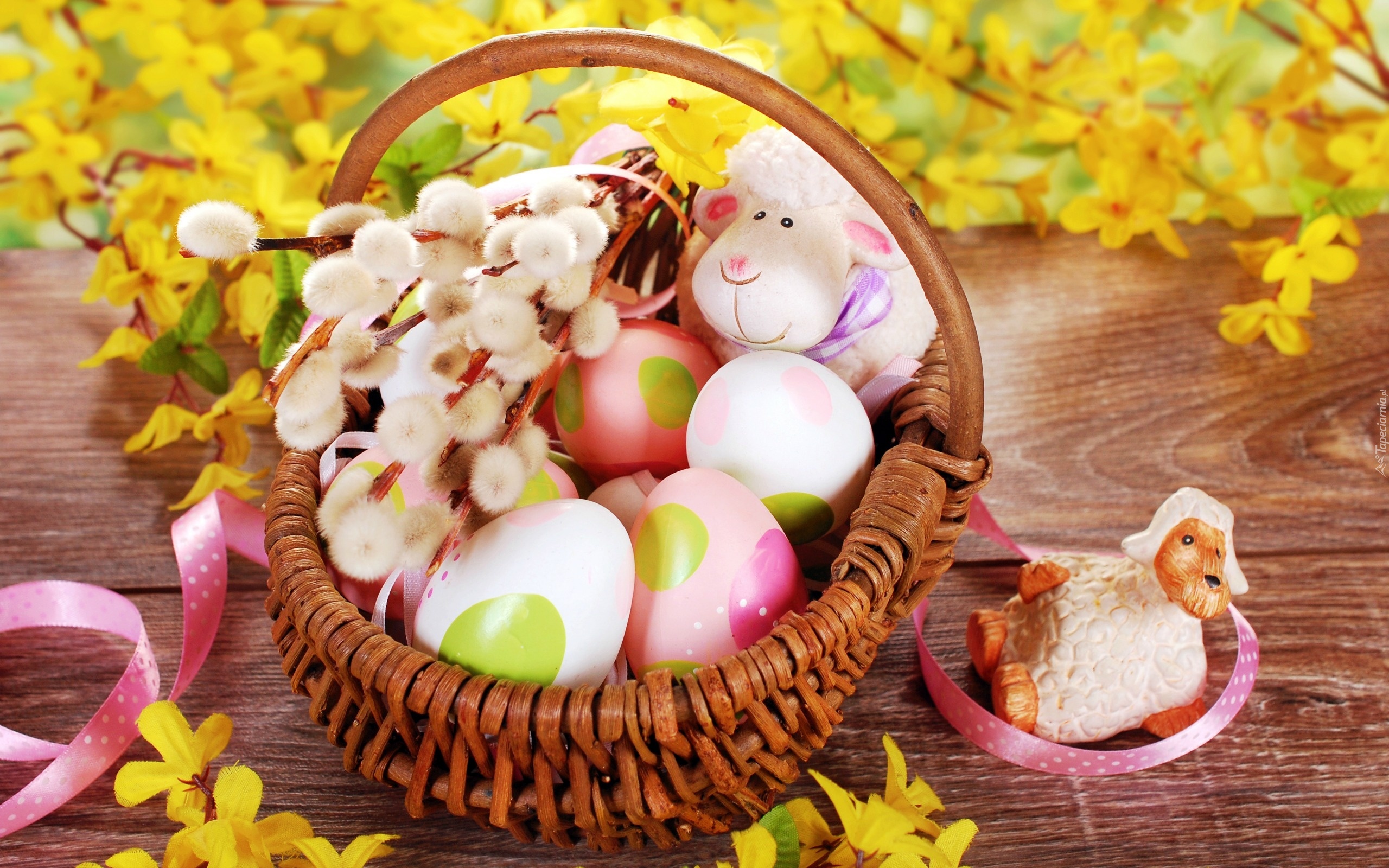 Edytor tapety: Pisanki, Baranki, Bazie, Kosz, Ławka, Wielkanoc
