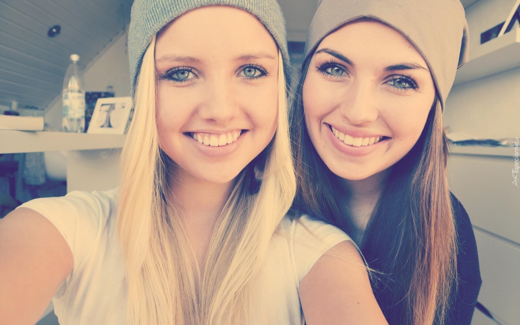 Edytor tapety: Uśmiechnięte, Dwie, Kobiety, Czapki, Makijaż
