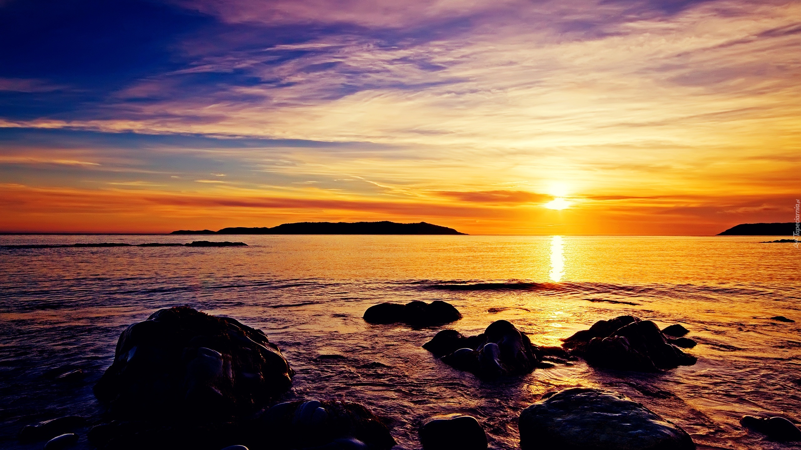 Edytor tapety: Plaża, Zachód Słońca, Kamienie, Niebo