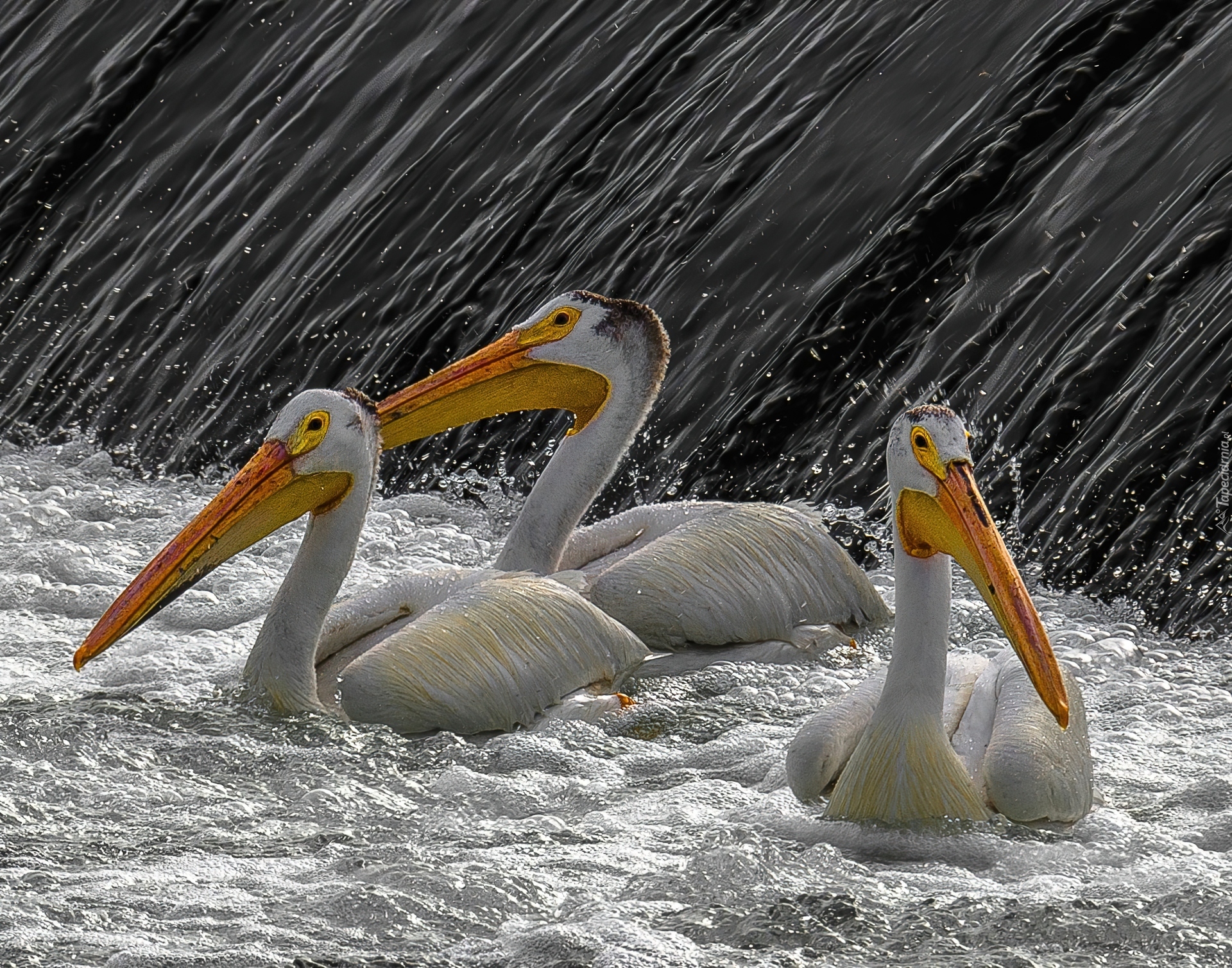 Edytor tapety: Trzy, Pelikany, Spływająca, Spieniona, woda