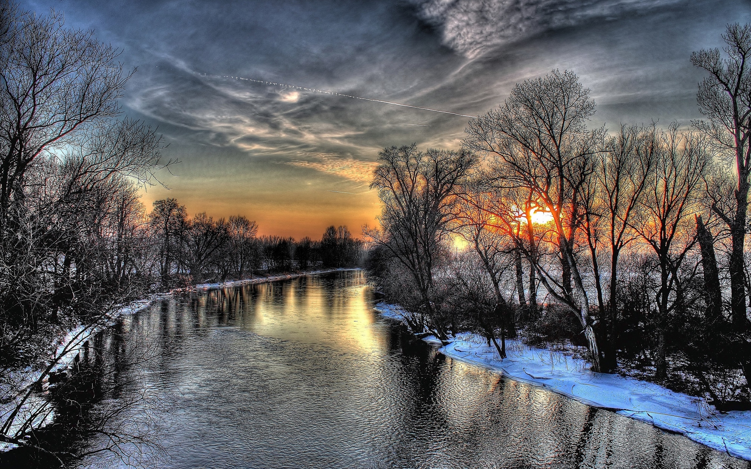 Edytor tapety: Rzeka, Drzewa, Zachód Słońca
