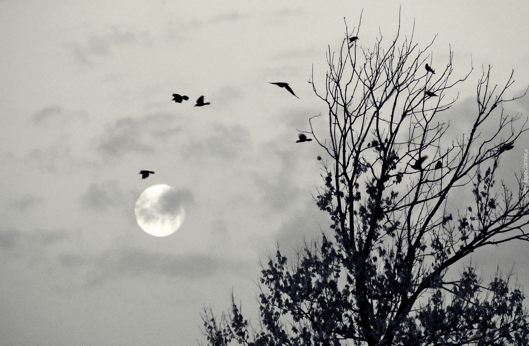 Edytor tapety: Księżyc, Drzewa, Ptaki