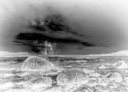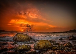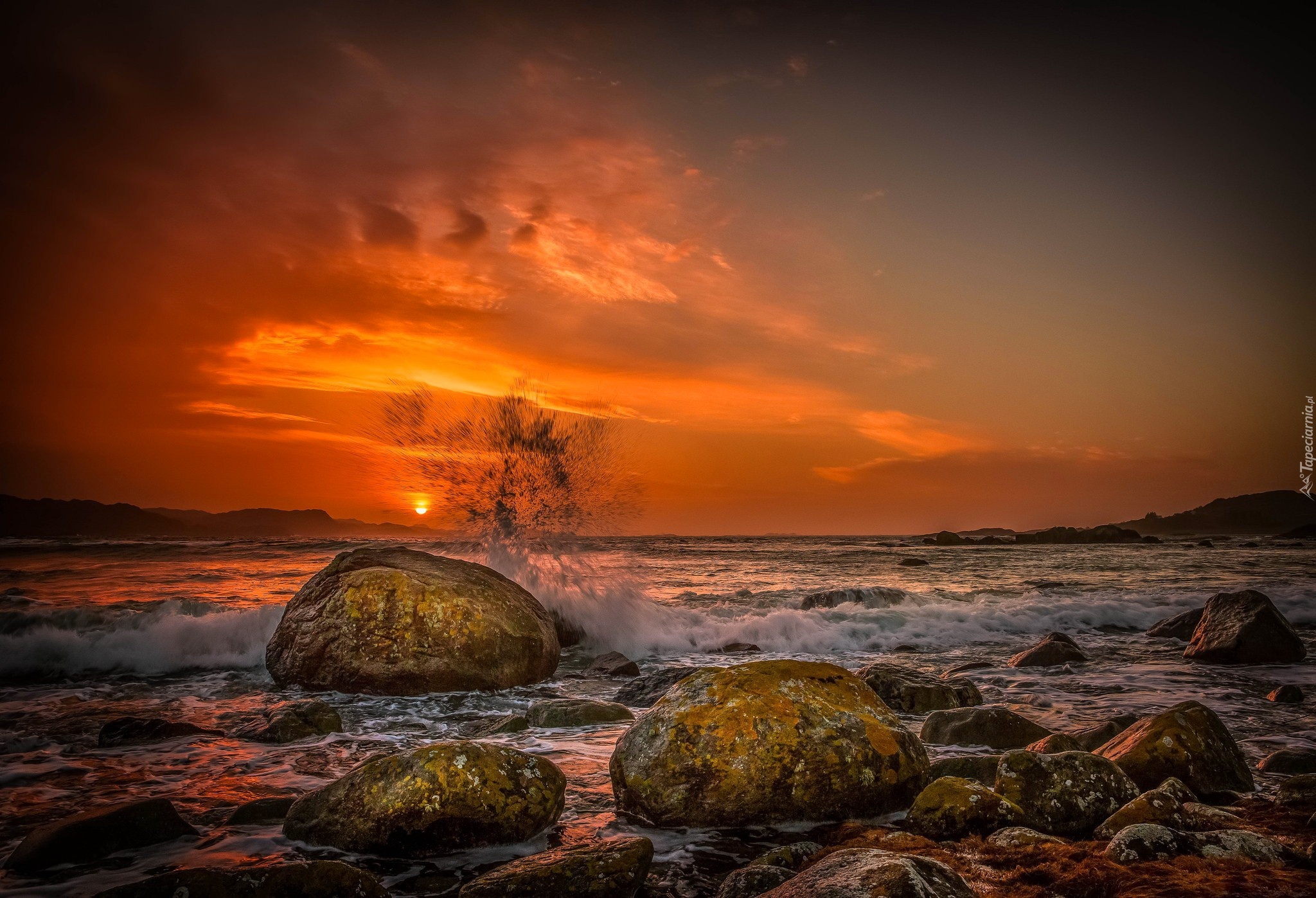 Edytor tapety: Zachód, Słońca, Morze, Kamienie, Fale