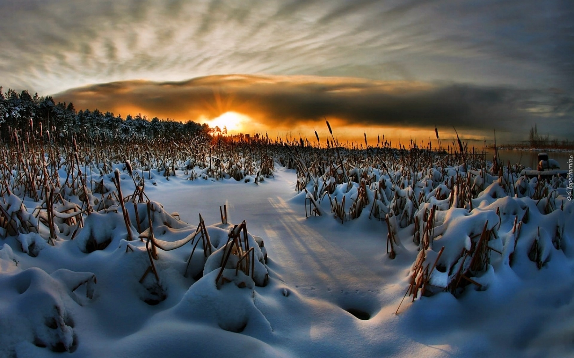 Edytor tapety: Zachód, Słońca, Szuwary, Śnieg