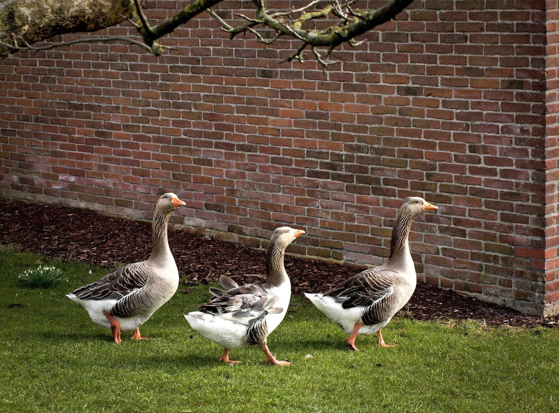 Edytor tapety: Trzy, Gęsi, Trawa, Ściana, Z, Cegły