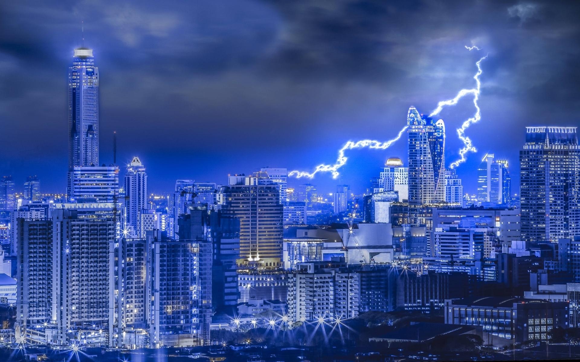 Edytor tapety: Drapacze, Chmur, Błyskawica