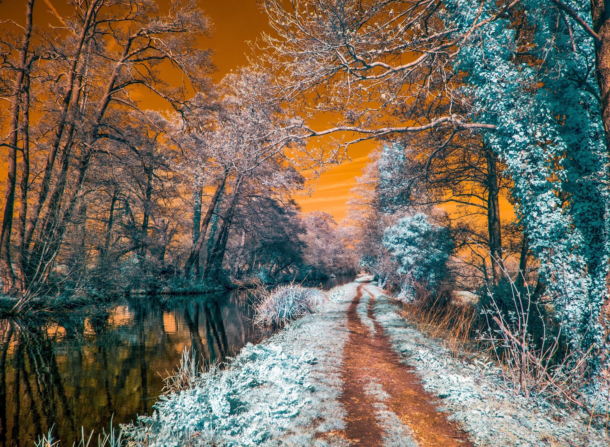 Edytor tapety: Rzeka, Drzewa, Ścieżka, Zachód, Słońca, Zima