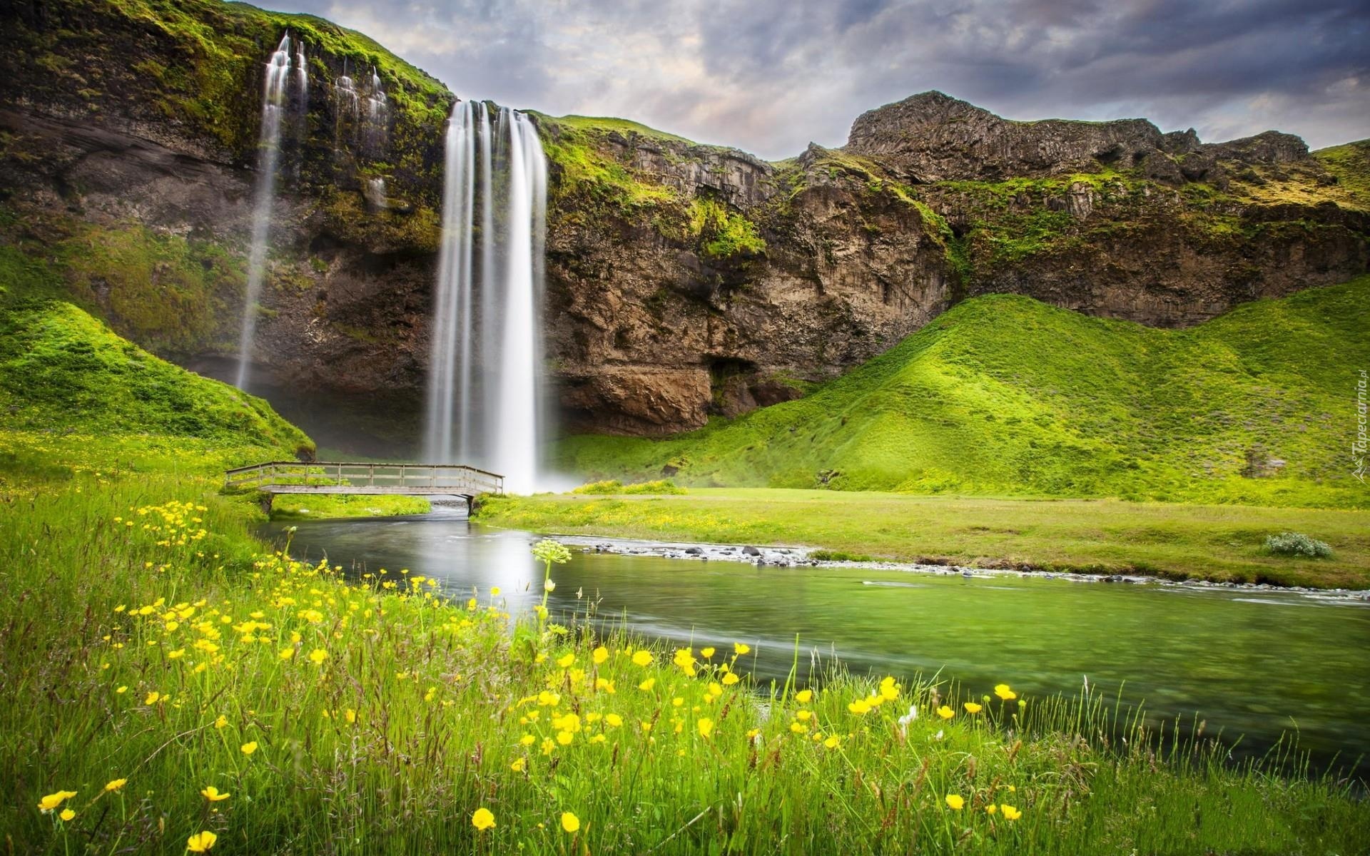 Edytor tapety: Wodospad, Skały, Rzeczka, Mostek, Łąka, Kwiaty, Wiosna