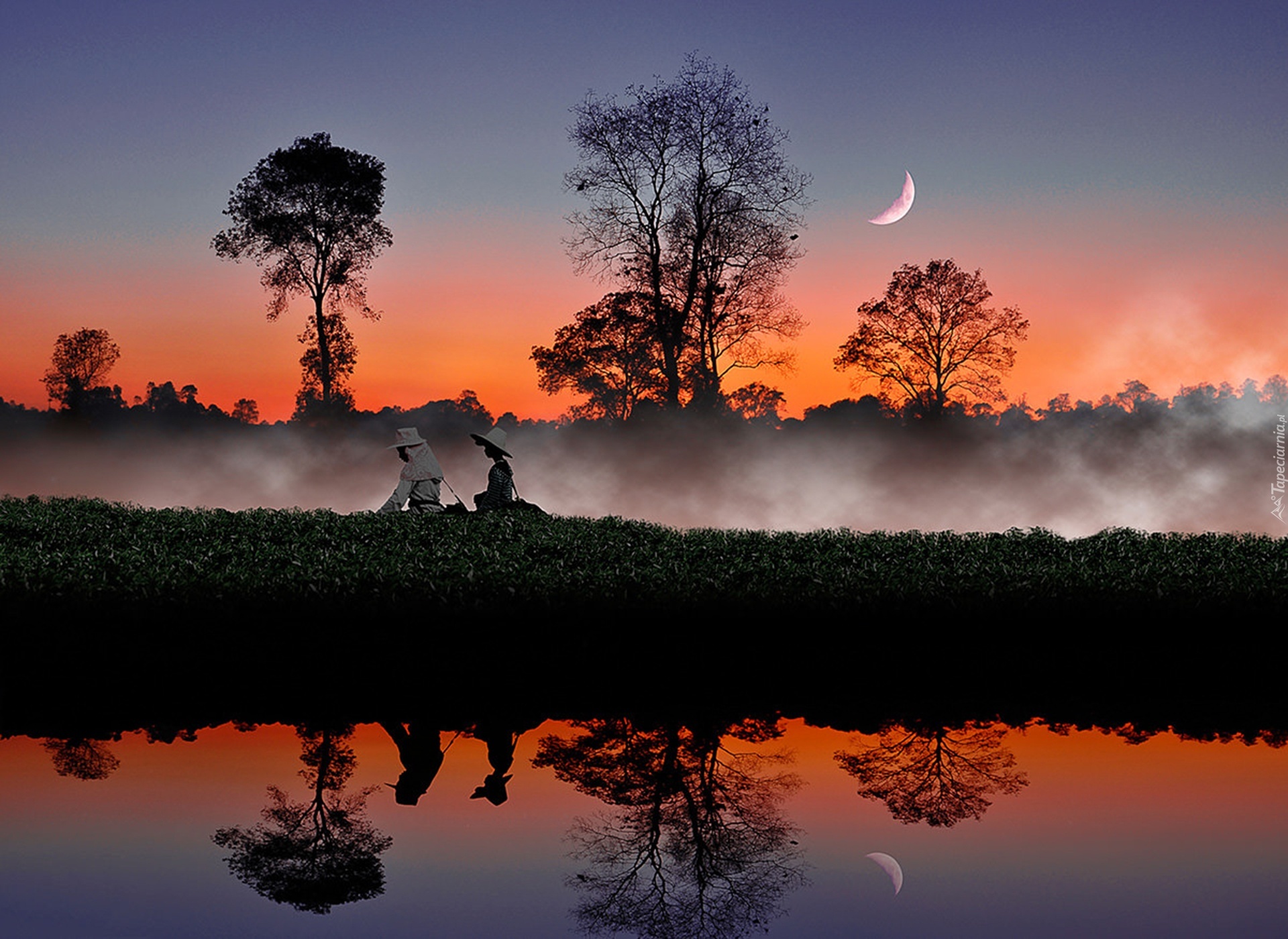 Edytor tapety: Zachód, Słońca, Mgła, Drzewa, Odbicie