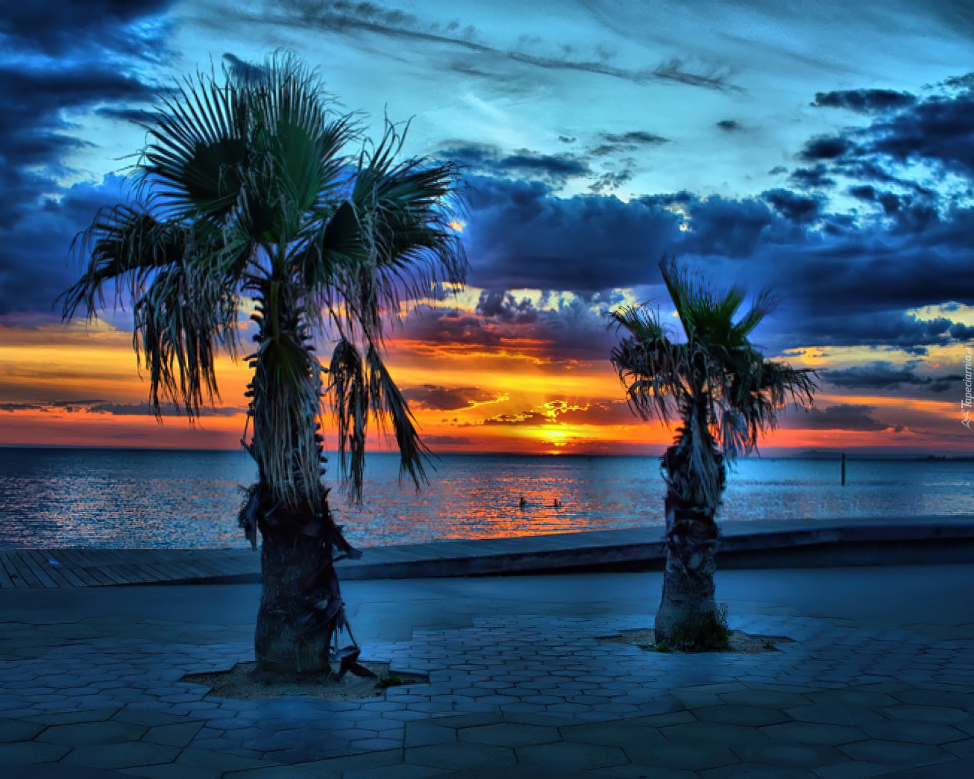 Edytor tapety: Zachód, Słońca, Morze, Palmy