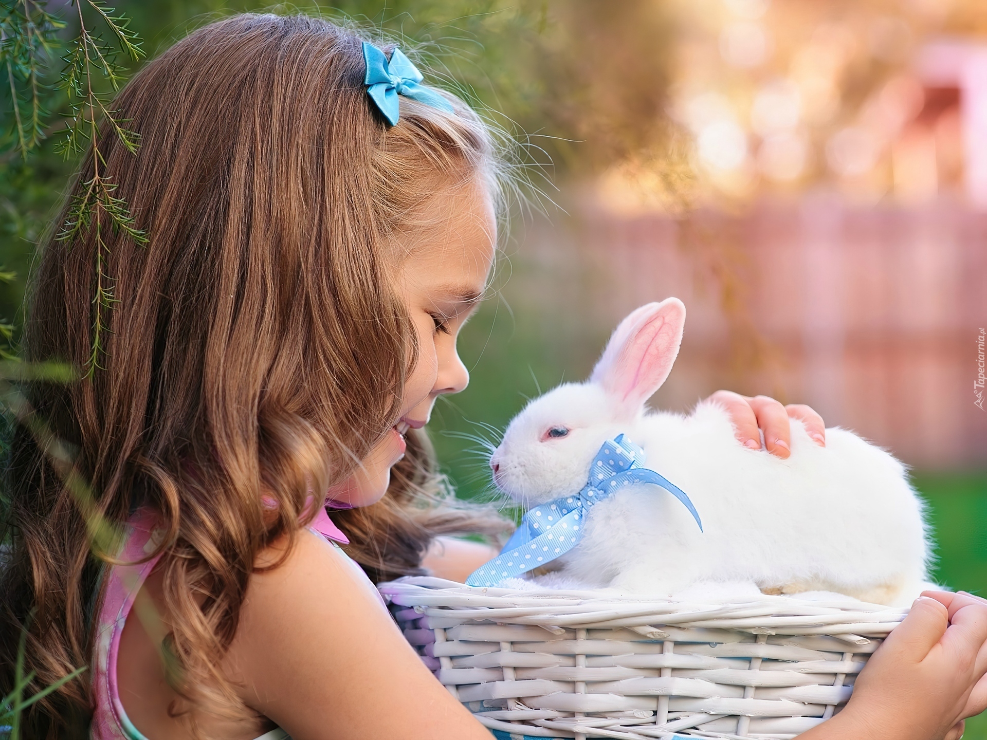 Edytor tapety: Dziewczynka, Koszyk, Królik, Ogród