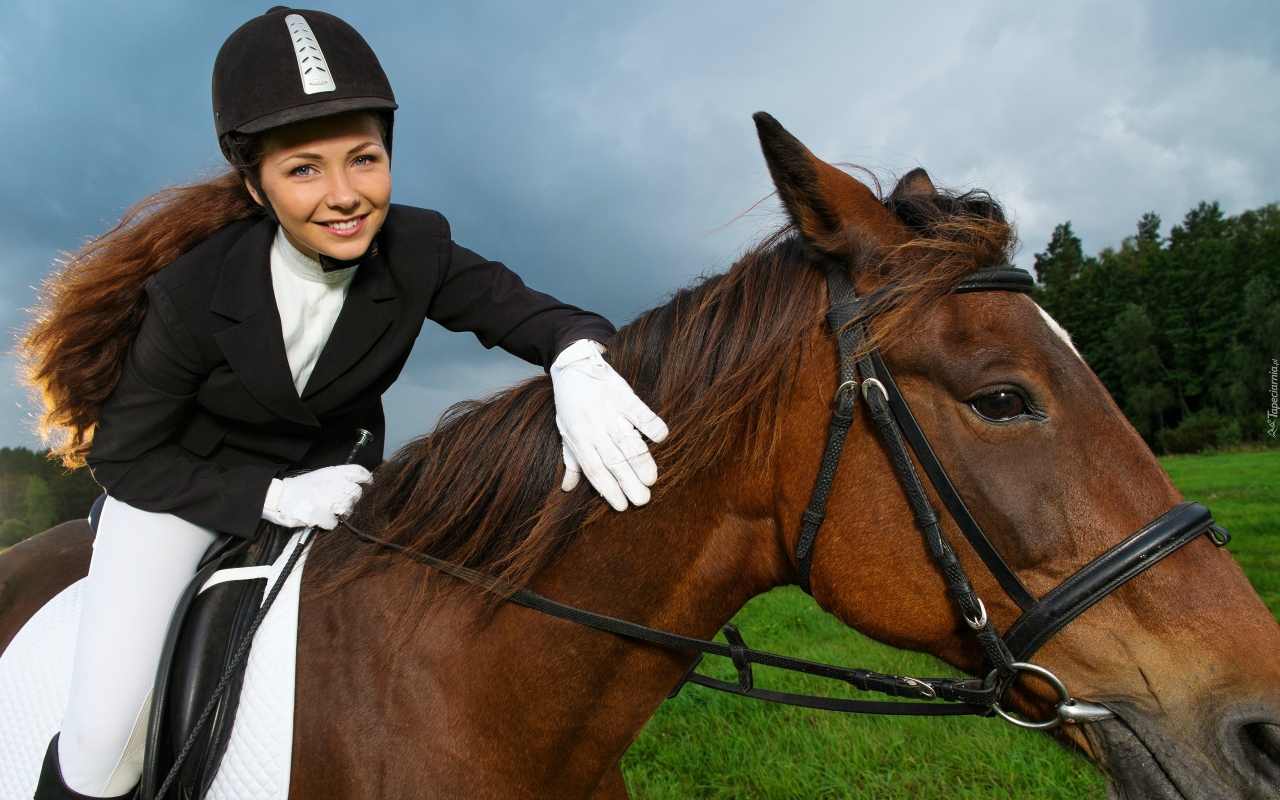 Edytor tapety: Dziewczyna, Dżokejka, Koń, Łąka, Las