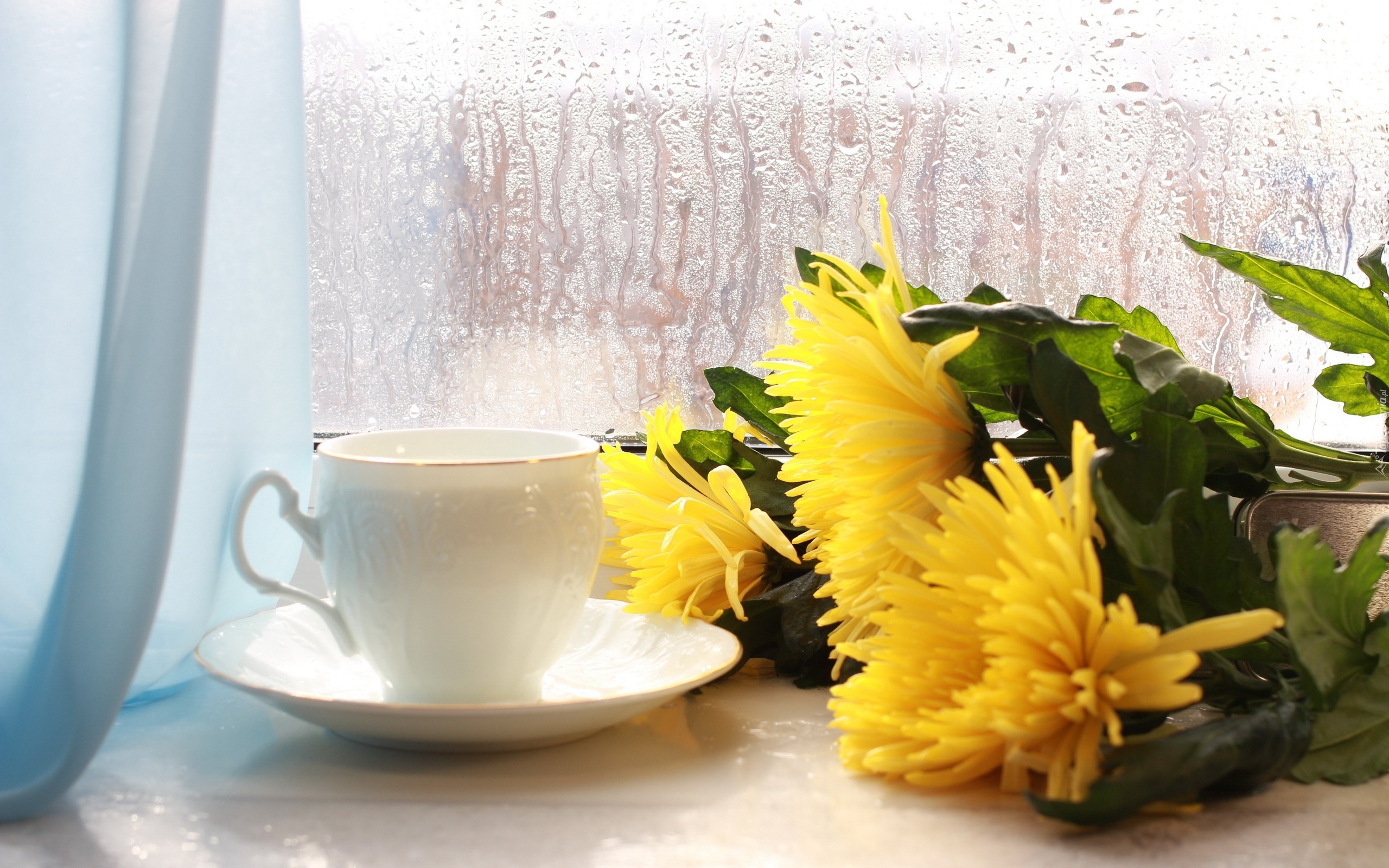 Edytor tapety: Filiżanka, Herbaty, Bukiet, Kwiatów, Okno, Deszcz