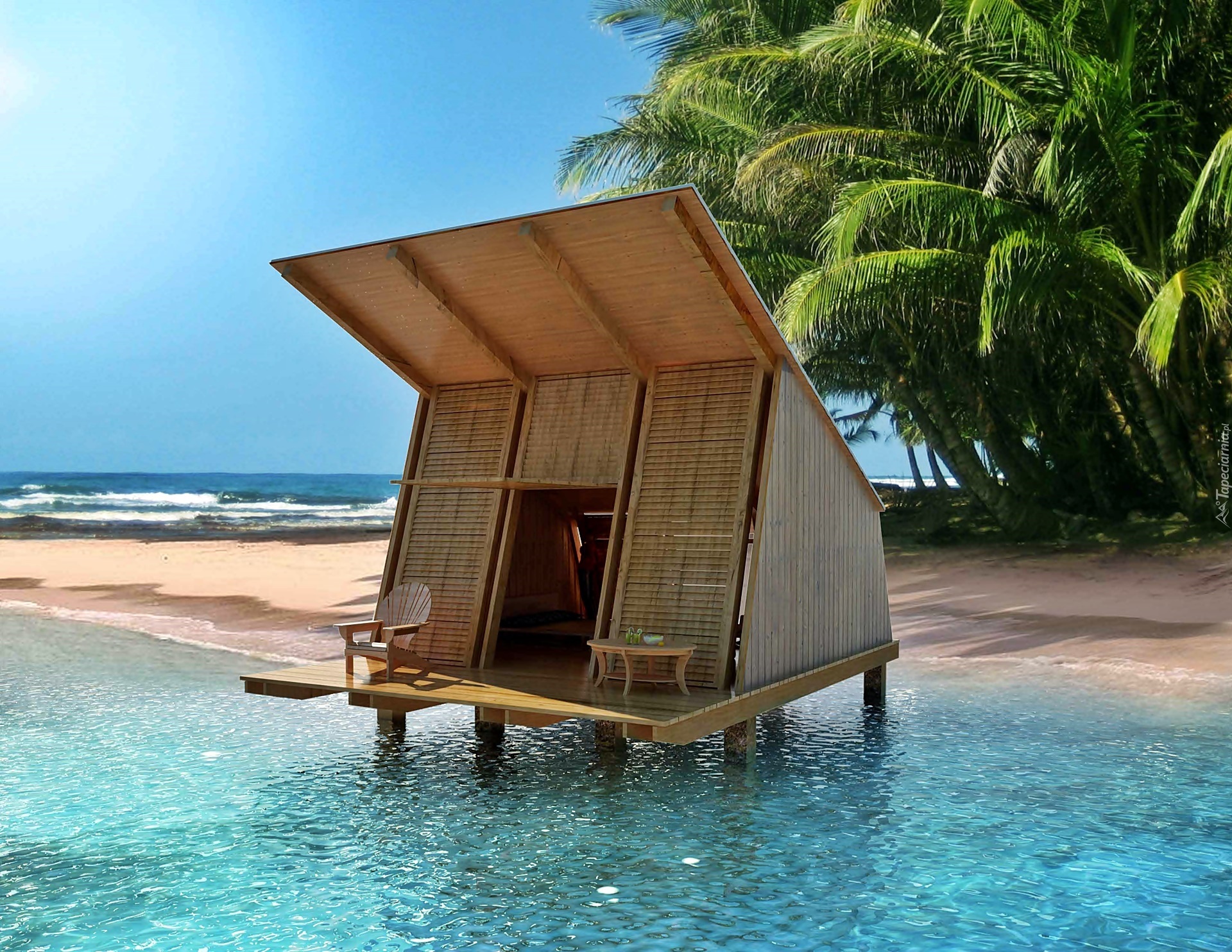Edytor tapety: Tropiki, Morze, Plaża, Palmy, Domek, Na Wodzie