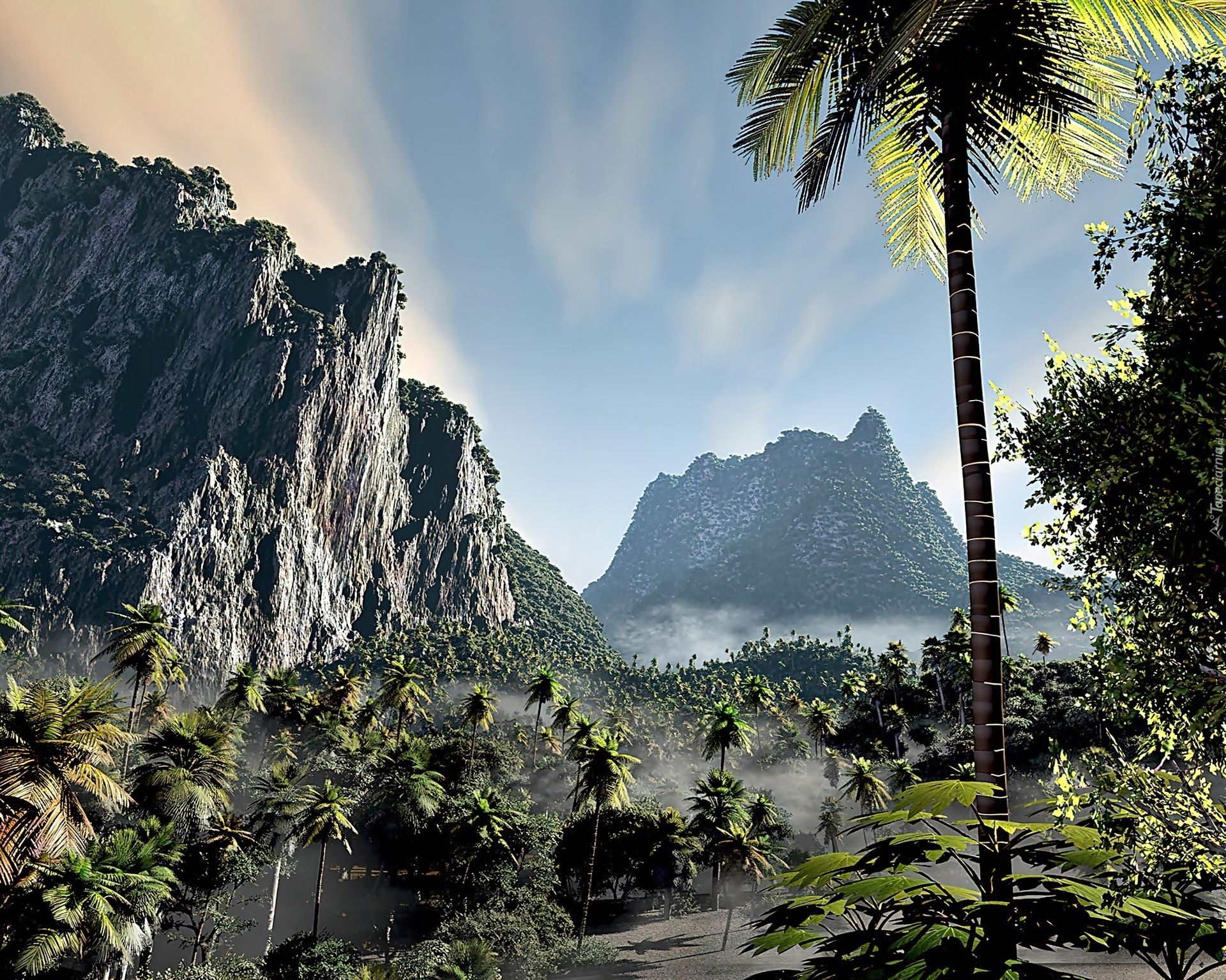 Edytor tapety: Góry, Las, Palmowy, Mgła, Przebijające, Światło