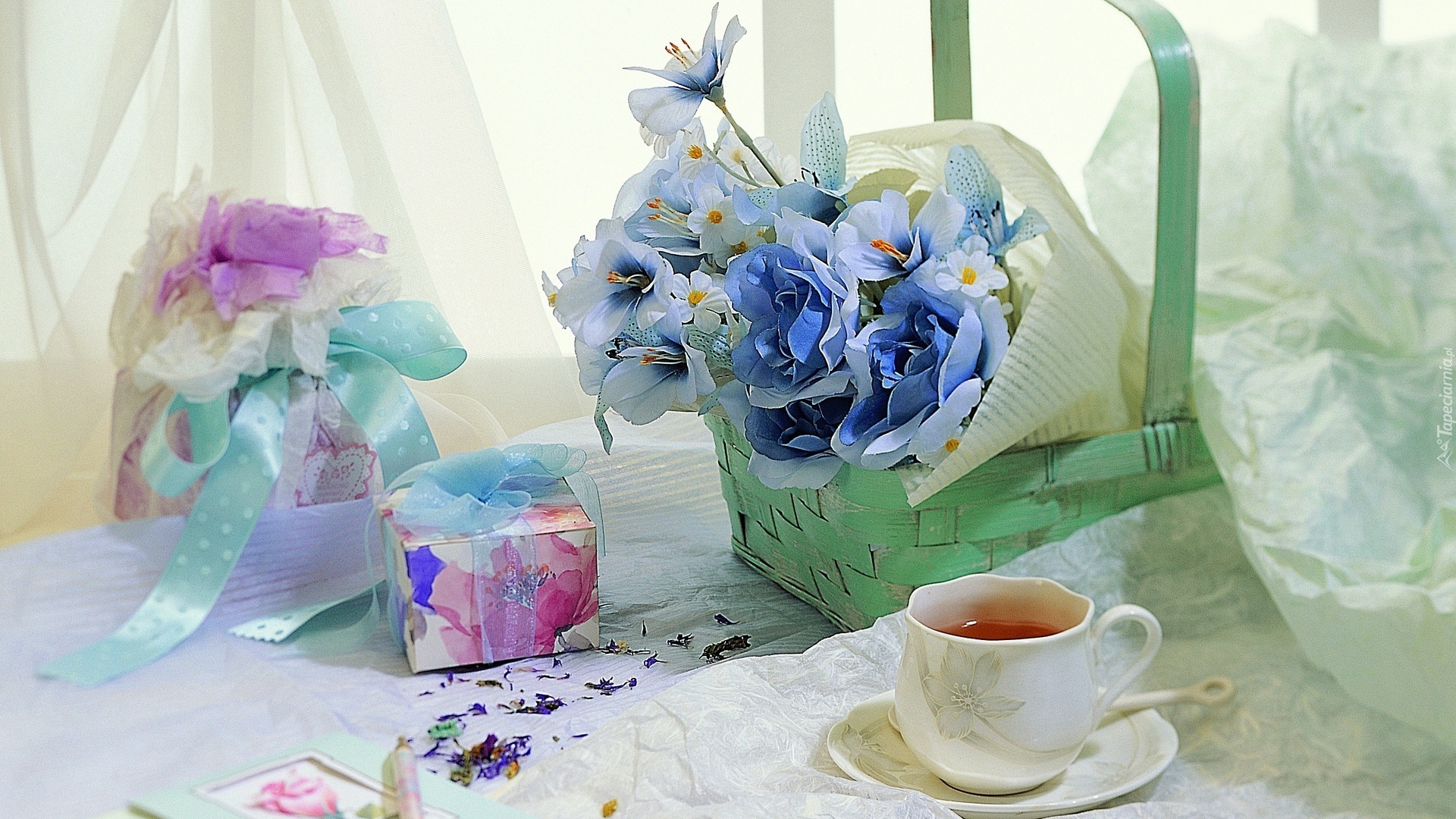 Edytor tapety: Herbata, Kwiaty, Prezent