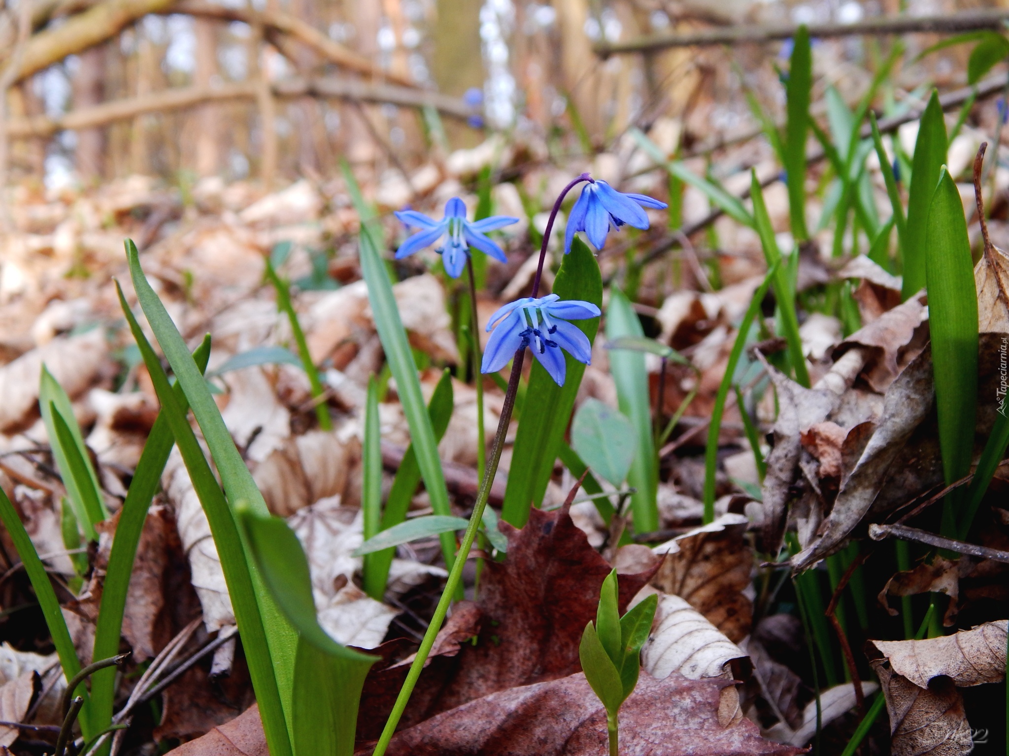 Edytor tapety: Cebulica Syberyjska, Niebieskie, Kwiatki, Liście, Wiosna
