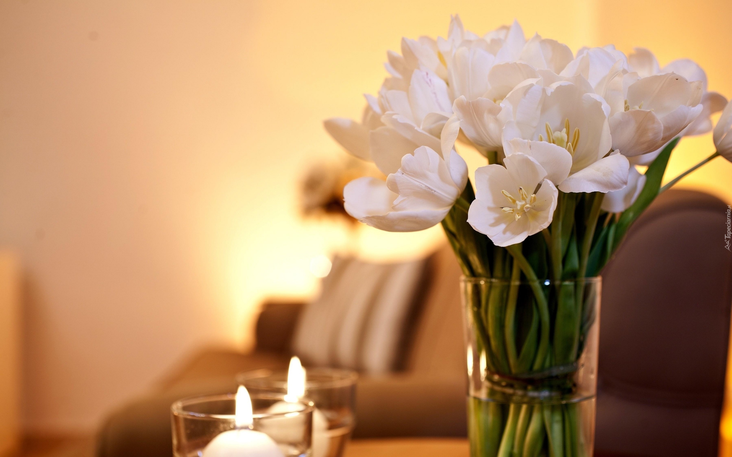 Edytor tapety: Bukiet, Białe, Tulipany, Świeczki