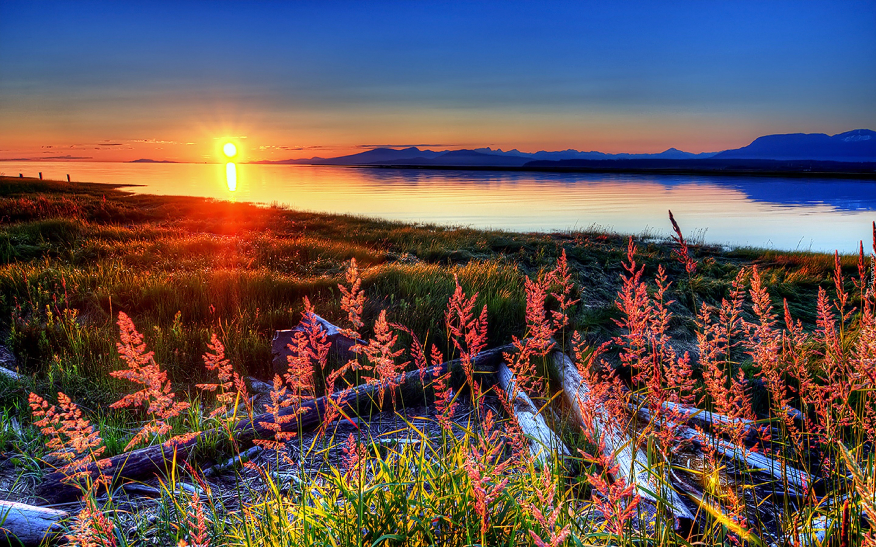 Edytor tapety: Zachód, Słońca, Jezioro, Rośliny