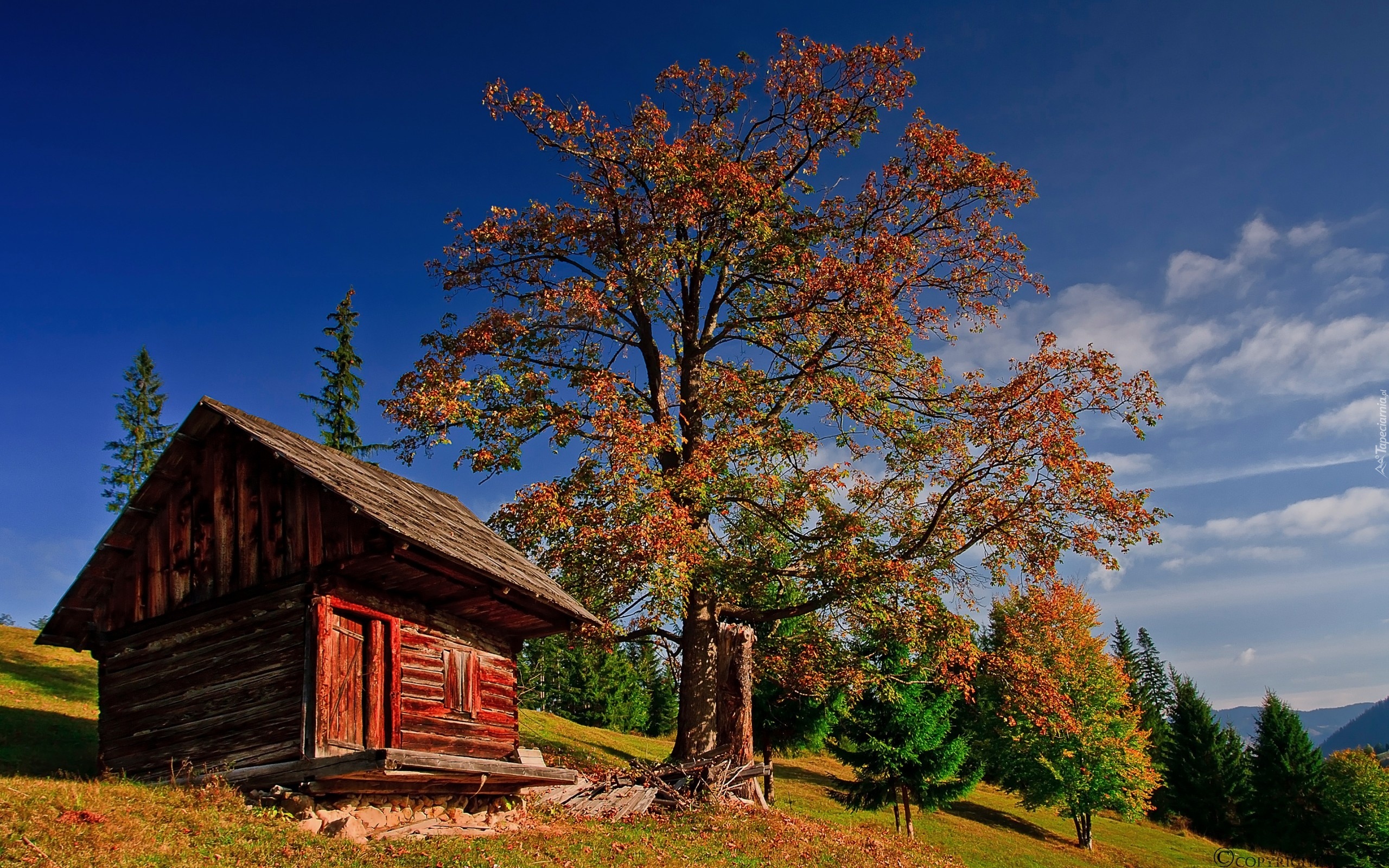 Edytor tapety: Góry, Domek, Drzewa, Jesień